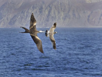 No land appeared on the horizon as the National Geographic Sea Bird motored north through the open Pacific towards La Entrada, the entrance to the sheltered waters of Magdalena Bay and Boca de Soledad. We spotted black-vented and pink-footed shearwaters slicing through the air just above the water’s surface. Tiny phalaropes lifted off the waves in small flocks, looking much too diminutive to be in such a broad stretch of unprotected sea, yet they were quite at home. People on the bow discovered two humpbacks and a few dolphins when we drew closer to Isla Santa Margarita. One cluster of sea lions briefly picked up speed by porpoising to keep up with the ship. This form of travel can be more efficient, because air produces less friction than water. A sea turtle floated a short distance away. We could see its large head, big front flippers, and barnacles on its carapace before it dove into the depths. Frigatebirds drifted overhead, and we watched one in hot pursuit of a gull in an attempt for an easy meal (see photo). Half a dozen gray whale spouts greeted us within Magdalena Bay, our first experience with the creatures that would be the focus of our time for the remainder of our voyage. The pale gray backs rose slowly, and then one breached suddenly!