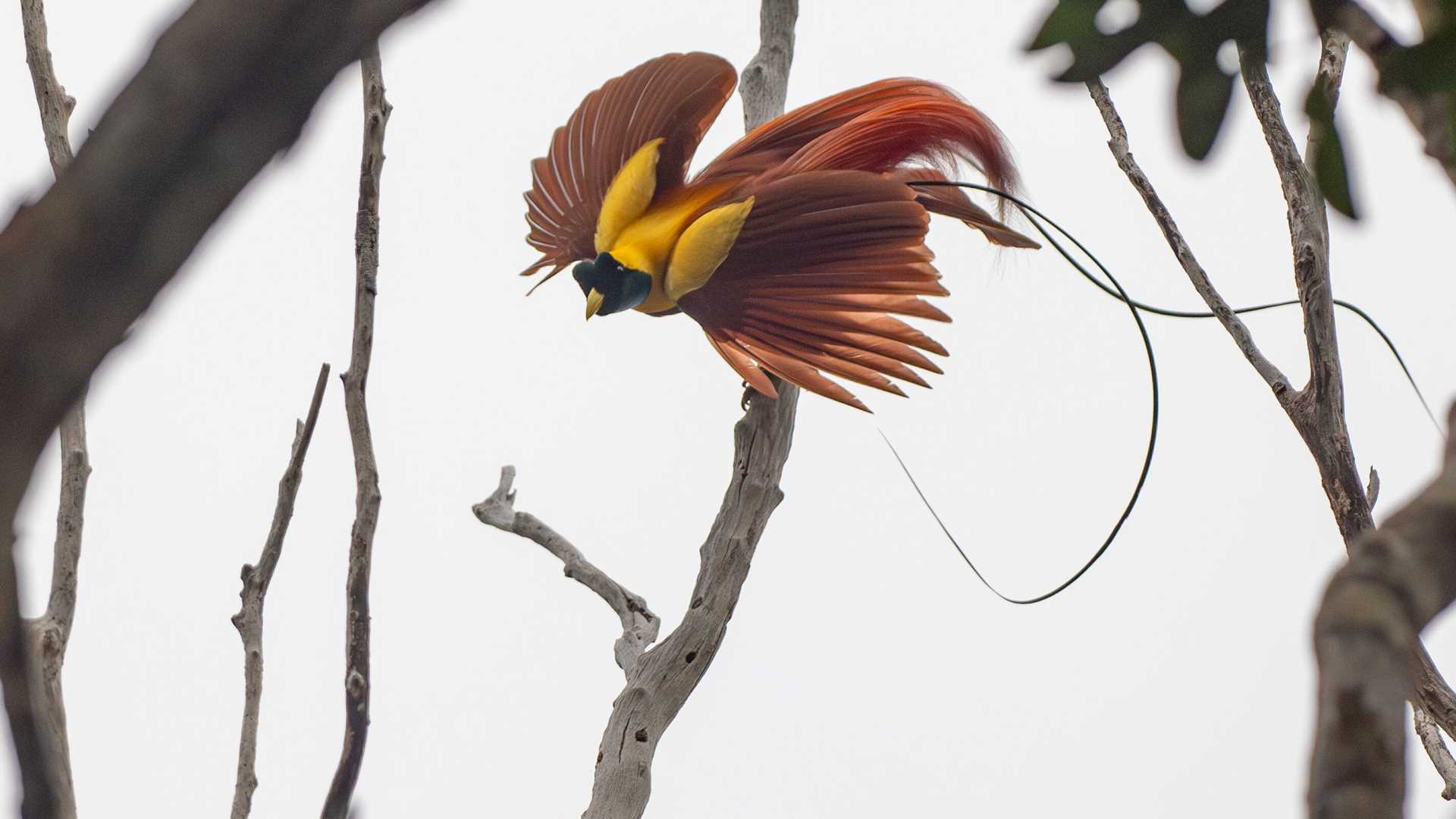 We awoke in the dark and set out across the water under a crescent moon and a blanket of stars. Crossing the dock, we entered a small village that was just beginning to stir and start the day. After one more crossing over a bridge that spanned a small tidal channel, we moved uphill through the forest as pale light began to seep up along the horizon. The forest rapidly came to life with the ethereal, bubbling calls of hooded butcherbirds, the emphatic whoops of helmeted friarbirds, and the raucous rattles of common paradise kingfishers. Just at dawn, we reached a hilltop with amphitheater seating pointed skyward. We had arrived at the display grounds for red birds-of-paradise. Our primary target soon made a noisy entrance: a crimson flash heading for the treetops. Over the next half hour, three of these gaudy males paraded through the high branches as they chased each other, preened, called, and shook impossibly long, wire-like plumes…all, unfortunately, in vain. Despite having a large audience, their desired audience (female red birds-of-paradise) never appeared, and they departed to feed. We headed down to the village. We stopped to admire spice imperial pigeons, Gurney’s eagles, and radjah shelducks along the way. Back in town, we were greeted by children on their way to school and people starting the workday. All had time for a quick “hallo!” and a few photos. Back on board, we joined the rest of our company who had opted for a more reasonable start time.