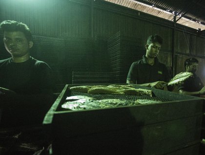 We also stopped to see one of the Maldives important industries, a small factory where skipjack tuna was being smoked and dried for export to Japan. This is a special process that lasts for many days and uses wood imported from Japan for smoking to produce katsuobushi, an important flavoring ingredient in dashi broth and many other Japanese dishes. There was a bit of wildlife as well – we made a brief stop at a pleasant little resort and strolled through the grounds out to the beach. Beyond the beach chairs, in the crystal clear water of the shallows, there were many small black-tipped reef sharks, great subjects for photography in the sparkling sunlight.