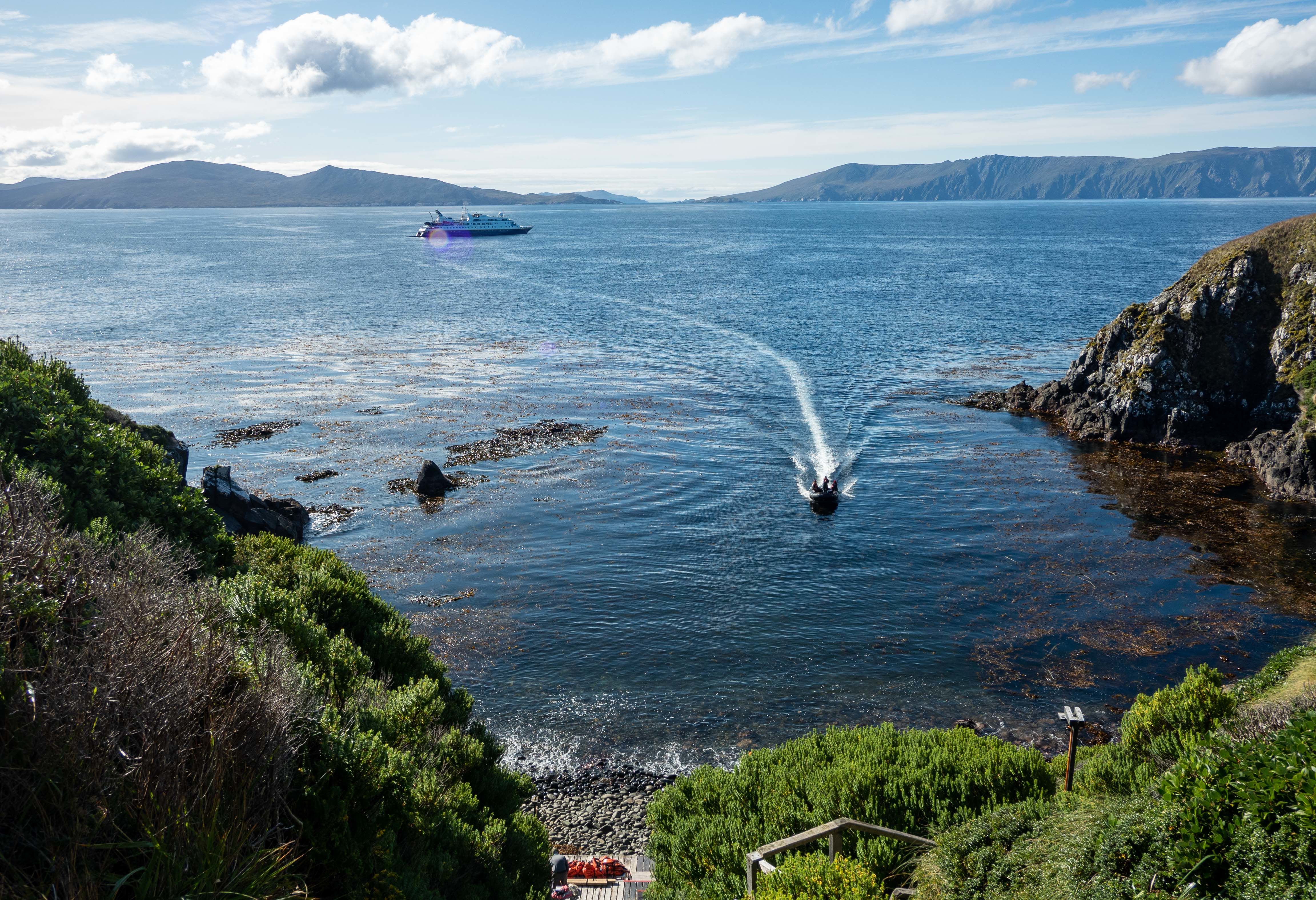 We left the Beagle Channel in the middle of the night to cross from Tierra del Fuego to the rarely visited Staten Island. Less than 1,000 people visit this island which is frequently referred to as ‘the end of the Americas.’ At the mouth of Franklin Bay on the northwest of Staten Island, we spent time among thousands of rockhopper penguins. Across the entire island, there are an estimated 130,000 breeding pairs of rockhoppers on the island, making the total population over half a million individuals! Several species of seabirds took advantage of the brisk winds around us and we had our first look of the striated caracara, one of the rarest in the group. We have many naturalists and guests on this trip who are passionate about birds of prey, so we enjoyed watching their skillful soaring overhead. In the afternoon, the weather cooperated nicely which allowed us to Zodiac to shore for a wet landing. Once ashore, we removed our life vests, donned our packs, and trekked along the ridge above Elgor Bay. The reward at the end of the trail was a historic lighthouse considered to be the southernmost lighthouse on the continent. This lighthouse inspired the adventure novel, The Lighthouse at the End of the World by Jules Verne, a tale which includes pirates and survival in one of the harshest environments in the world.