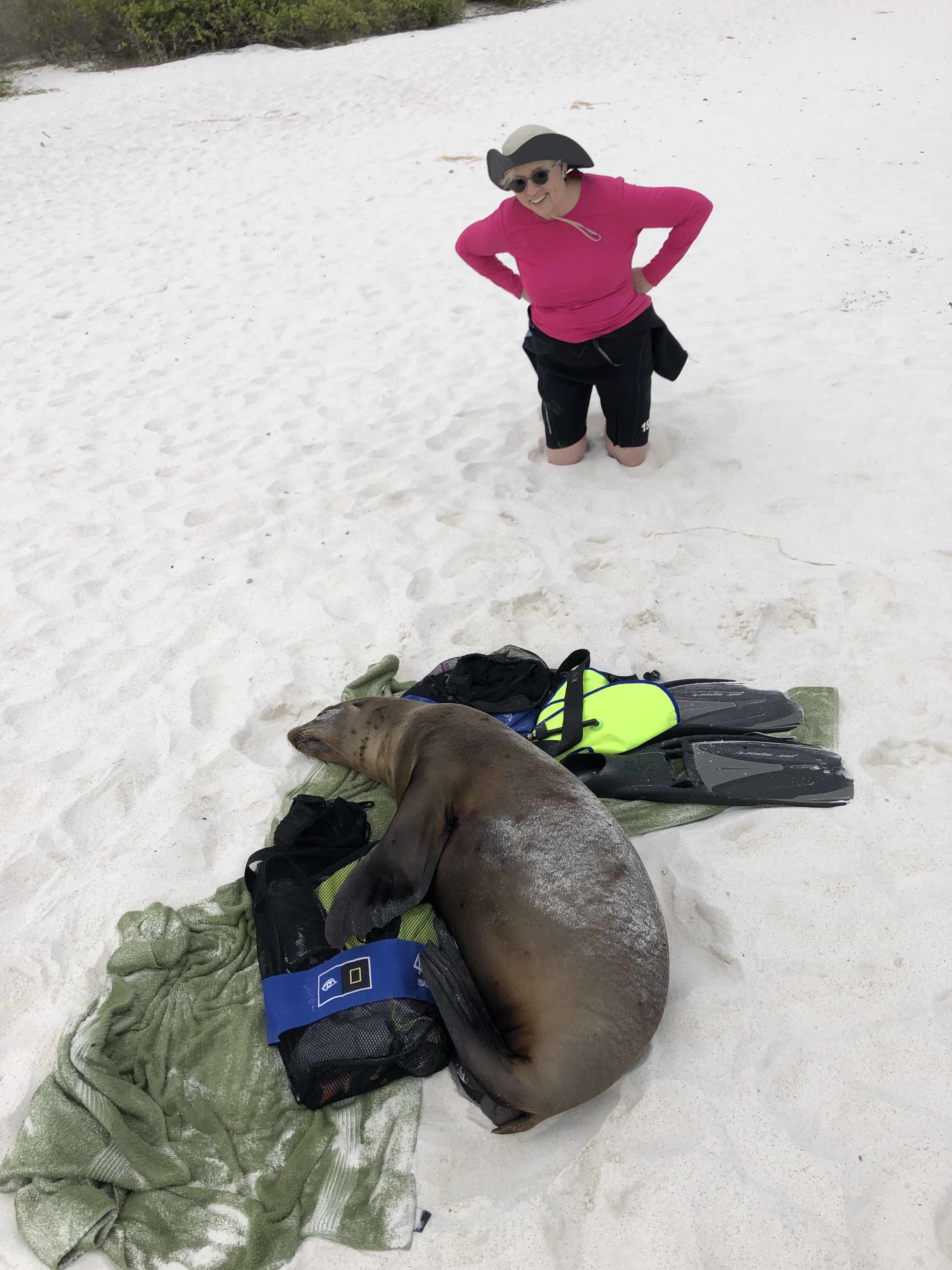 Today National Geographic Islander is anchored in Espanola Island. We started the day with a snorkeling outing in Gardner Islet for those who wanted a bit of water activity. There was also the option to stroll along a white sand beach with plenty of sea lions as companions! Later, we visited Punta Suarez for a hike along a cliff where we got to see waved albatrosses take off.