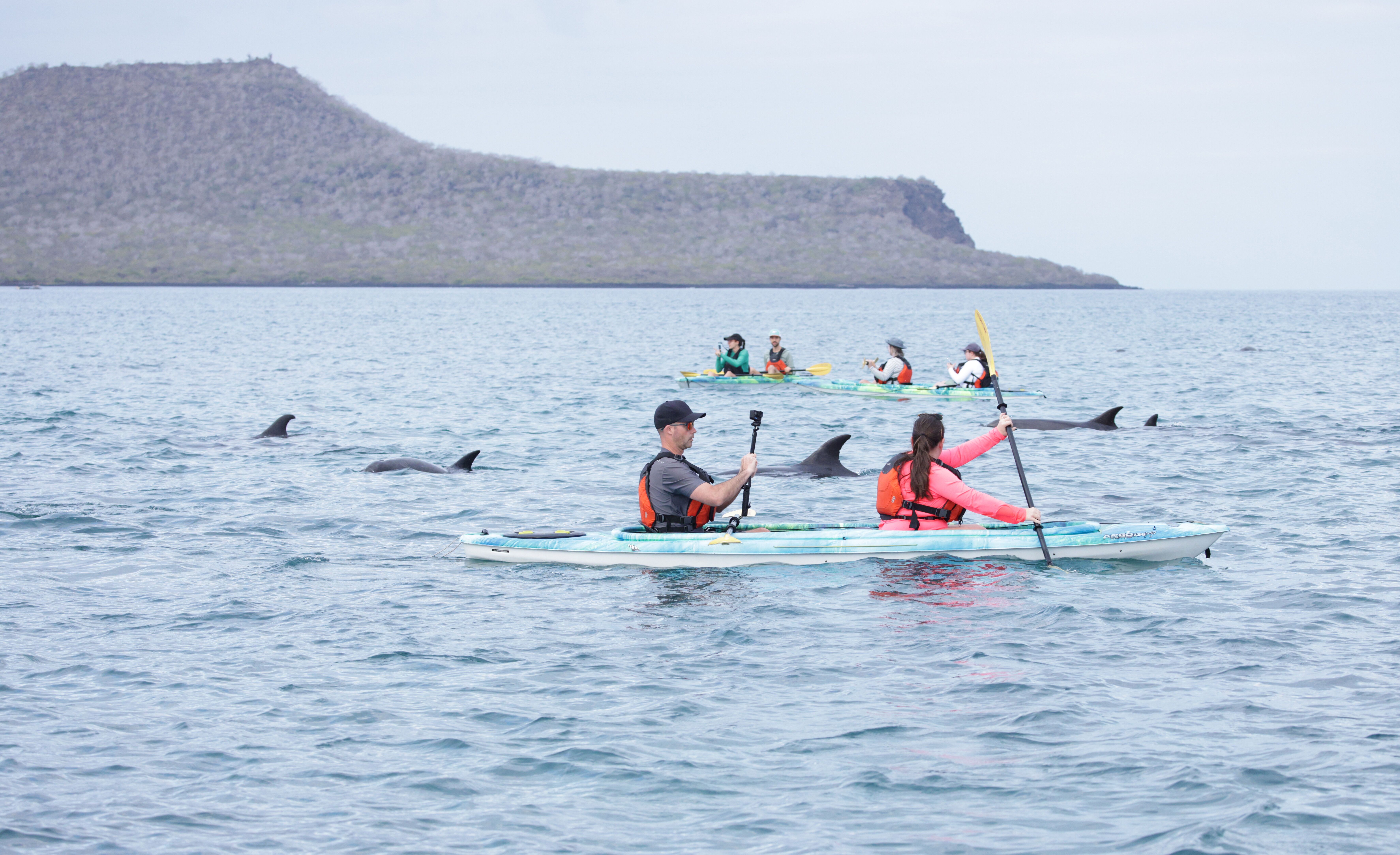 Sadly, our expedition aboard National Geographic Gemini is nearing its end. Our day began with a hike at the base of towering cliffs. A steep ascent led us to a plateau of a palo santo forest, sparse and otherworldly. Almost immediately, we were surrounded by red-footed boobies nesting in low trees and Nazca boobies on the ground. A highlight was spotting a short-eared owl perched silently among a lava crevice, camouflaged and hunting storm petrels. The calls of frigatebirds rang in the air, with their inflated red pouches on full display in a mating show. After our hike we enjoyed water activities, such as kayaking along the cliffs and snorkeling. In the late afternoon, we landed on the coral sand beach of Darwin Bay. Guests enjoyed a relaxing stroll along the shoreline bordered by mangroves and nesting bird colonies. The presence of swallow-tailed gulls, lava herons, and marine iguanas provided excellent photo opportunities.