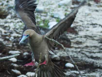 Swallow tailed gulls, Nazca boobies, and the very colorful red footed boobies together with the contrasting landscape, give this place a special kind of atmosphere. The white coralline beach and the red mangroves are the island’s nesting place for red footed boobies. Minor frigate bird males today are into being seen by the females, we saw a few inflated pouches and had a wonderful chance to photograph them from up close.