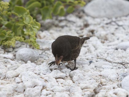 After breakfast we landed on a small beach for an amazing walk. All the animals were so close to us and their quantities were astonishing. Red mangroves are nesting sites for red-footed boobies and salt bushes are preferred for frigatebirds to nest and rest on. Here, the opuntia cacti grow as low bushes with soft, short spines because there are no giant tortoises or land iguanas to eat them. Almost at the very end of our walk, we found some very cute baby frigates.