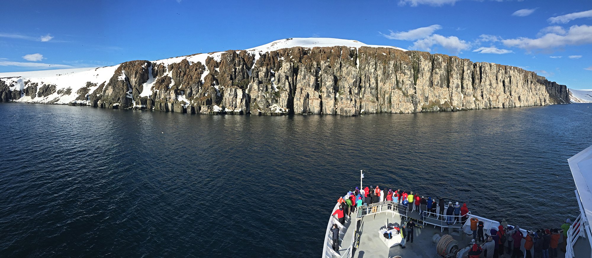 This island has an open caldera, which allows us to sail inside with the National Geographic Endeavour. This is a collapsed caldera, and its front part has slide into the ocean, forming a perfect little cove, a spectacular visitor site in Galapagos. The caldera is big enough to fit a few boats, but we were fortunate that for our last day, we had the privilege of having this place all to ourselves.