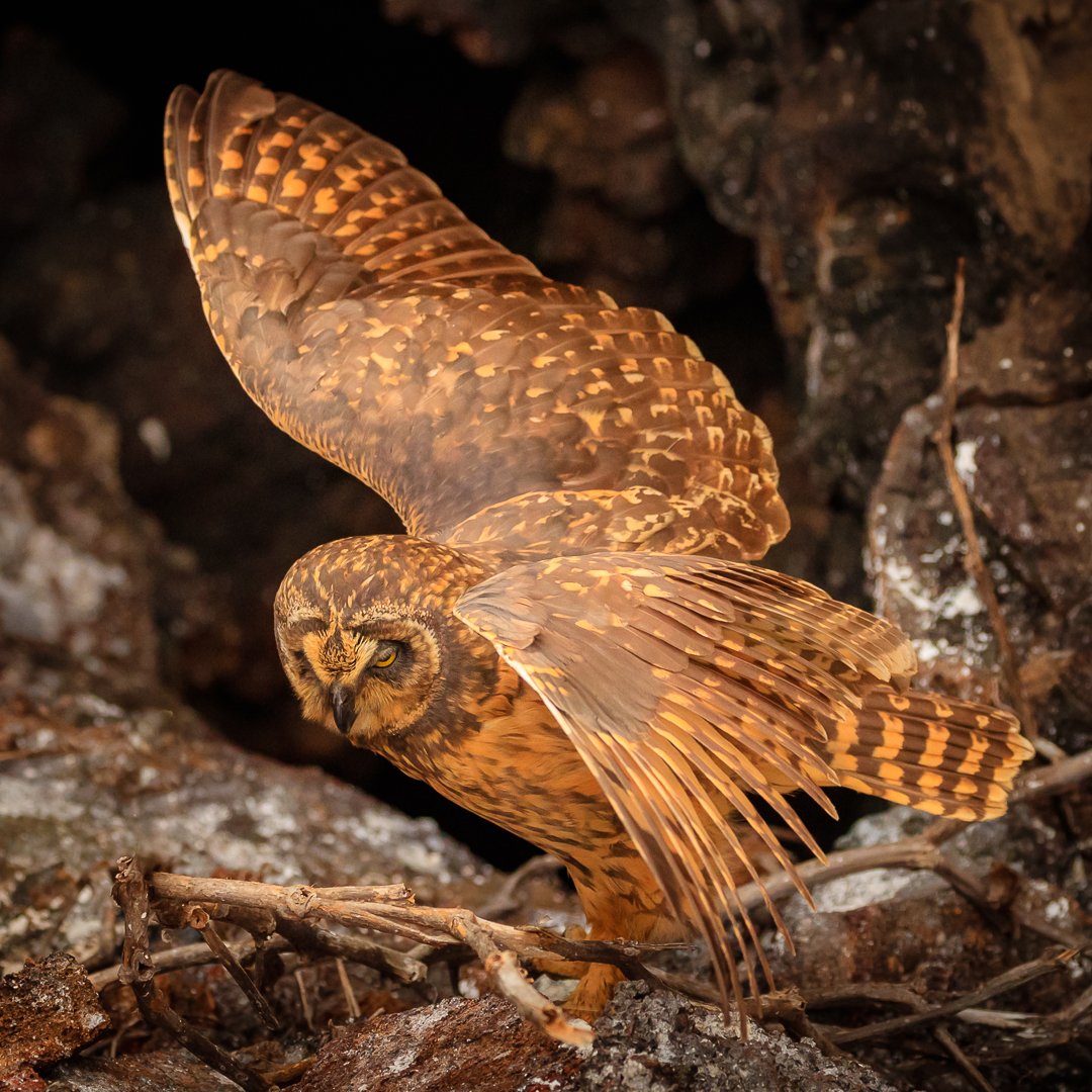 Interestingly, the Galápagos owls have adopted a unique hunting style. Instead of being nocturnal, like most owl species in the world, the Galápagos owls hunt during the day, choosing to use their camouflage plumage to blend in with the dark, rust-colored lava and ambushing the petrels as they come and go from their nesting burrows.