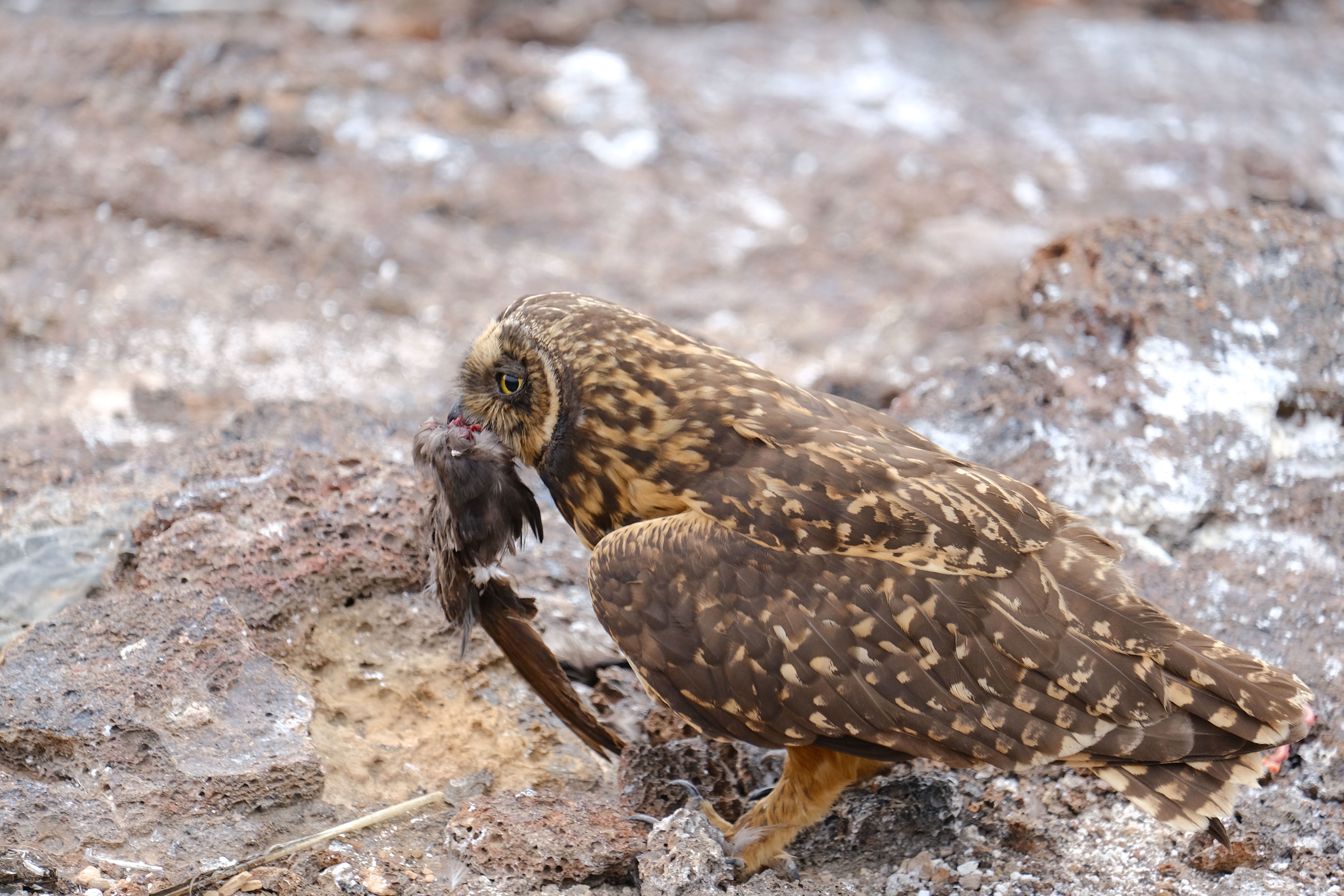 Genovesa is a low and flat island, located on the northern hemisphere, and home to over one million seabirds. Due to the isolation of this island, there are no land reptiles have ever settled here, leaving this place solely to the various winged species of the archipelago. Our morning begins with a walk along Prince Philip’s Steps location, inland. We find Nazca, red-footed boobies and frigatebirds. All of the desert vegetation, such as palo santo and muyuyo trees looked still gray, as the rain has not started yet. Along the trail, we are also able to spot frigatebird chicks and juveniles being fed by their parents. On the rocky terrain, we observe hundreds of lava tubes, and thousands of storm petrels fluttering along the seashore, as they try to land. Short-eared owls, the only diurnal predator on the island, are seen hunting. Our young guest Kaden captured an incredible moment on camera!
