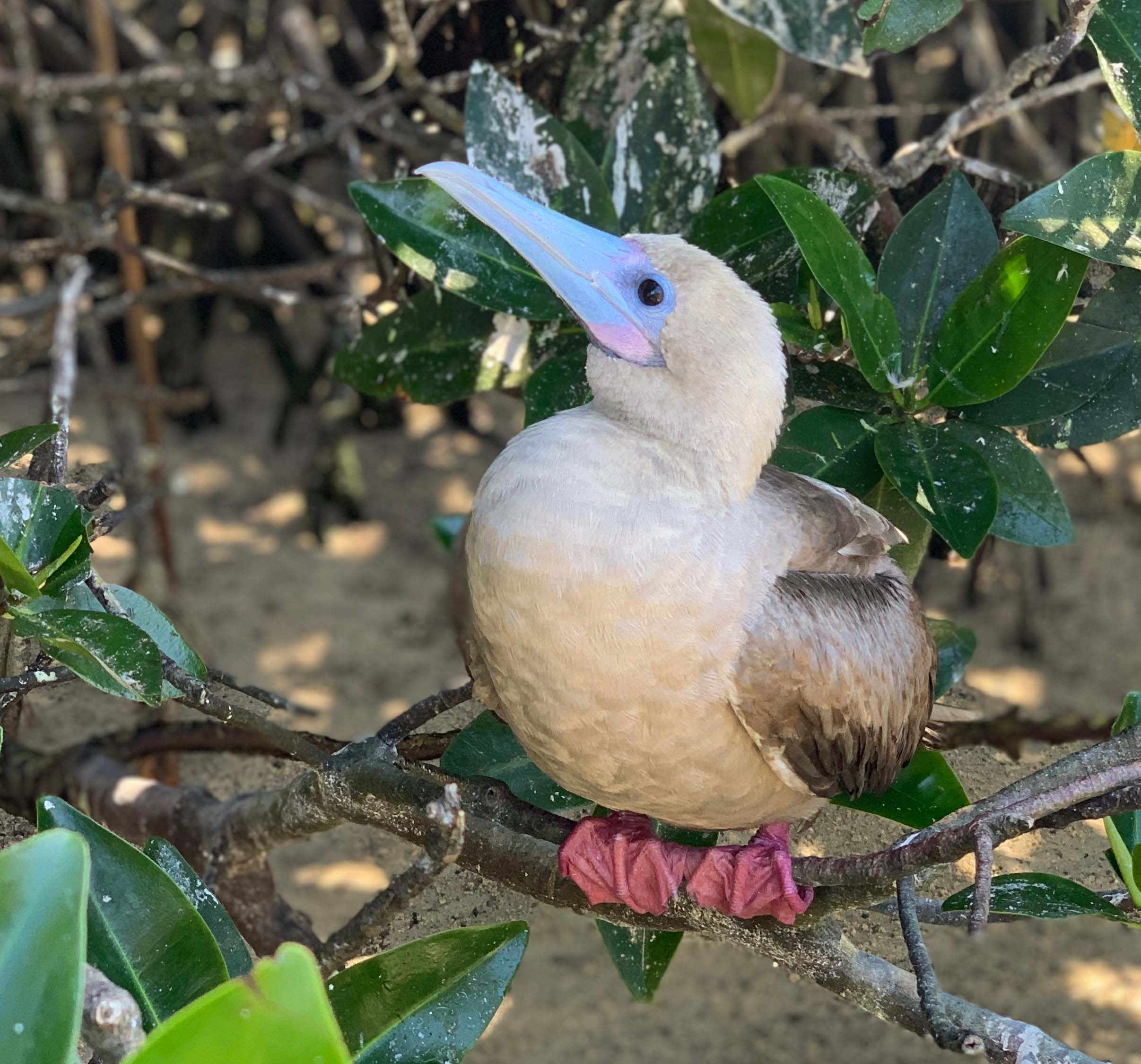 Later in the afternoon, we lead our guests up the steep and rustic steps and across the point of the island to search for petrels and short-eared owl, which is consider the top predator of the island, due to the lack of Galapagos hawks. We identified the large ground finch and the unique sharp-billed ground finch feeding on dry seeds along the lava rocks. On the bushes we admired the many fluffy baby frigates in their nests and the much larger juvenile Nazca boobies. Out on the flat lava flow many storm petrels were swooping around and disappearing into their nest holes. We found several of the well camouflaged short-eared owls that were hunting these numerous petrels.