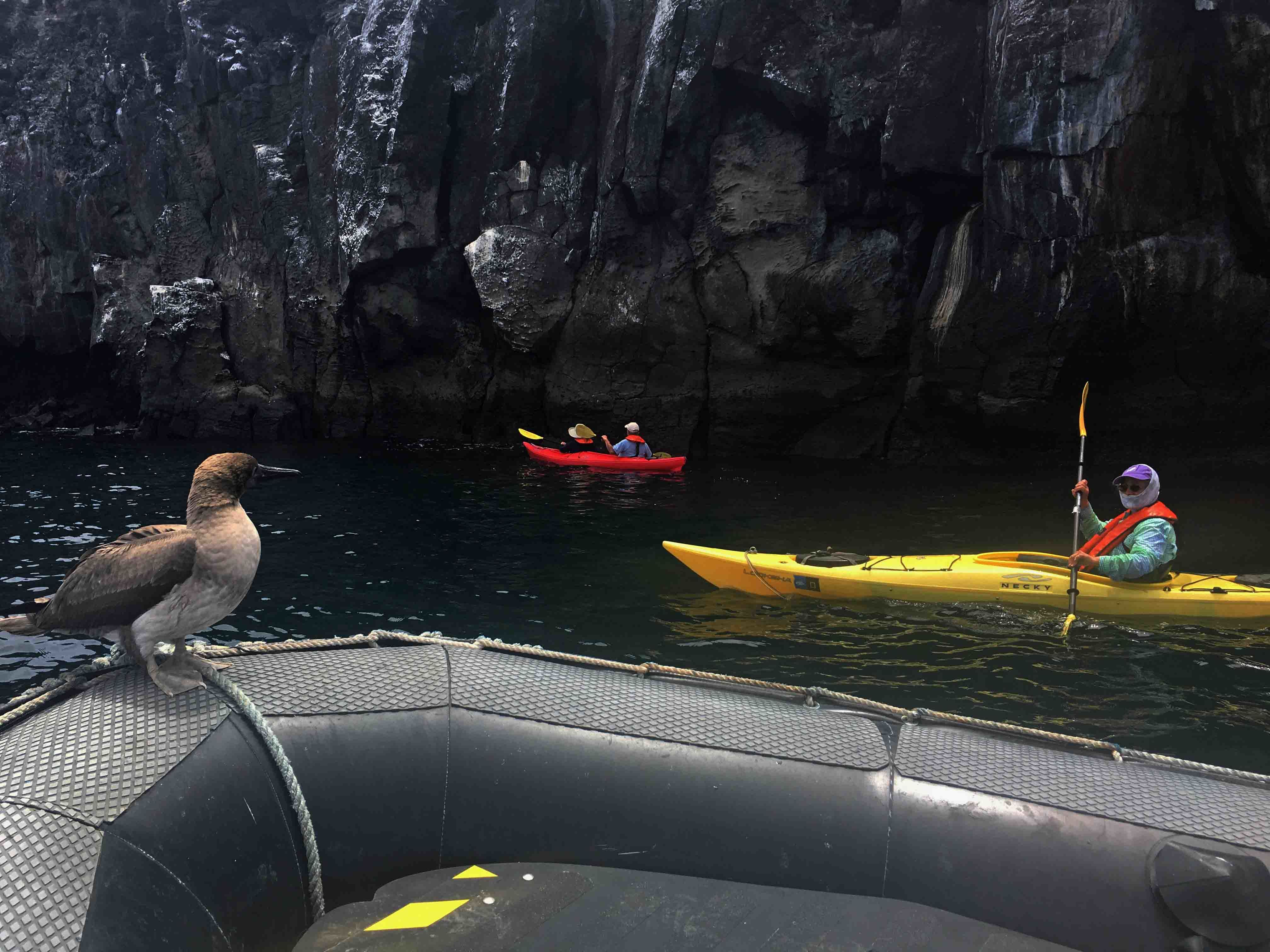 Right after breakfast we are ready to explore. Some guests visit a site called Prince Phillip’s Steps, named when Prince Phillip visited the place. Here we look first for the Galapagos fur seals, a species that was hunted for its fur but is now well protected and likes to hang out in caves along these cliffs. Right after landing, we spot Nazca boobies nesting, great frigate birds, and our first red-footed boobies. Shearwater and storm petrels appear as we get to the outer side of the island.