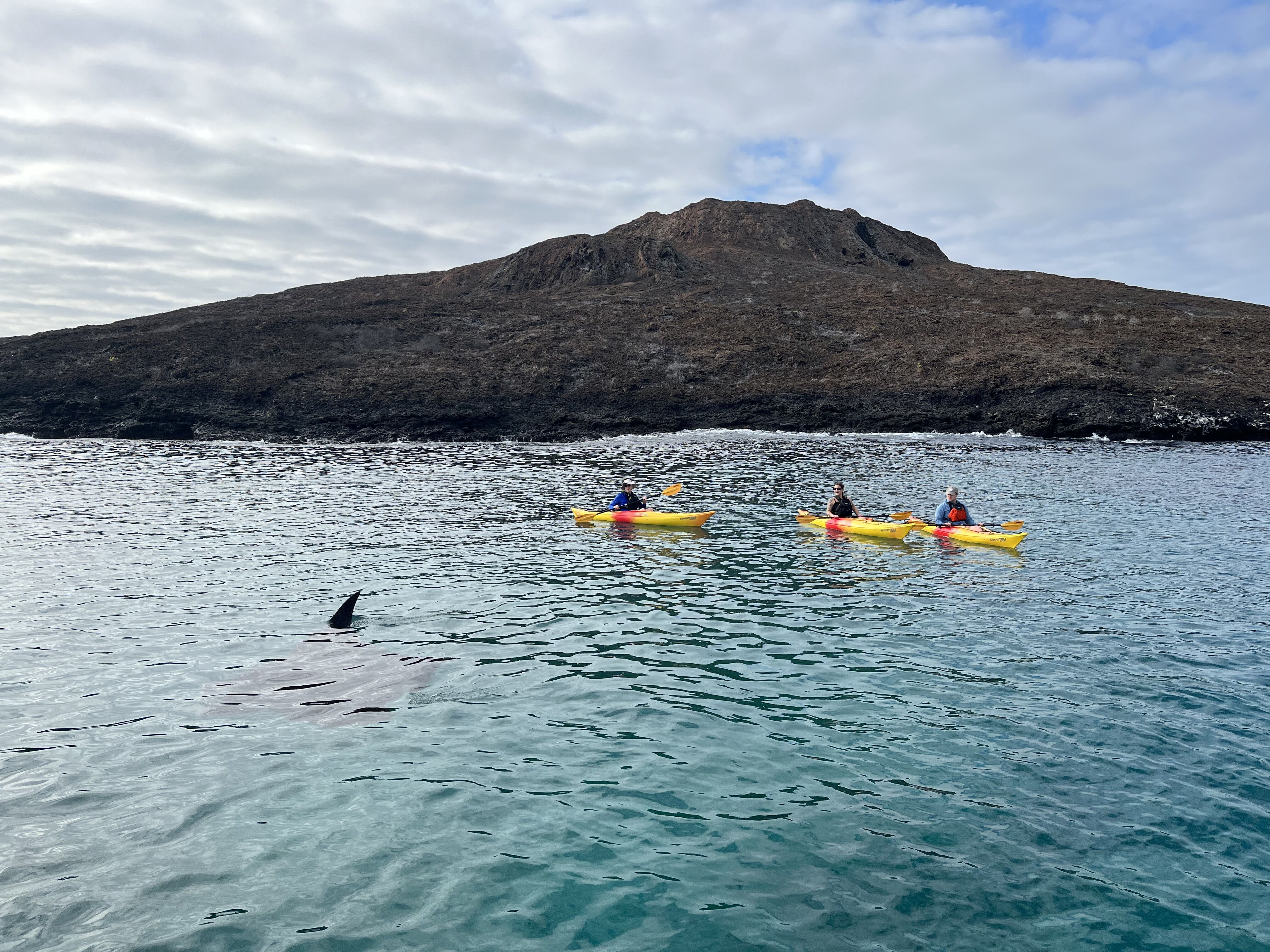 We returned to National Geographic Islander II to prepare for the next outing. Some of our guests enjoyed the rest of the morning on the beach, while snorkelers left Darwin Bay to go swimming along the caldera. They observed so much marine life, including trumpetfish, Moorish idols, playful sea lions, pompanos, and whitetip reef sharks.