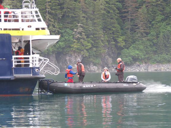 On the last full day of our voyage, we woke in Endicott Arm near the Dawes Glacier. We spent the morning enjoying Zodiac tours to the face of Dawes Glacier and watched multiple calving events. We were also able to spot several harbor seals, waterfalls, and a couple harbor porpoises on the way. After lunch we had the opportunity to participate in a polar plunge. Forty people decided to brave the frigid water for a short swim. Those of us not eager to jump into glacier water were able to watch from the bow. After the polar plunge, we warmed up on board as we started transiting towards Juneau. On the way, we stopped at a beautiful waterfall to once again admire the amazing natural beauty of Alaska. During our farewell recap, we were treated to a quick visit by a humpback whale. We ended our day with a slideshow made up of our favorite photos and memories of an amazing week on board National Geographic Quest .