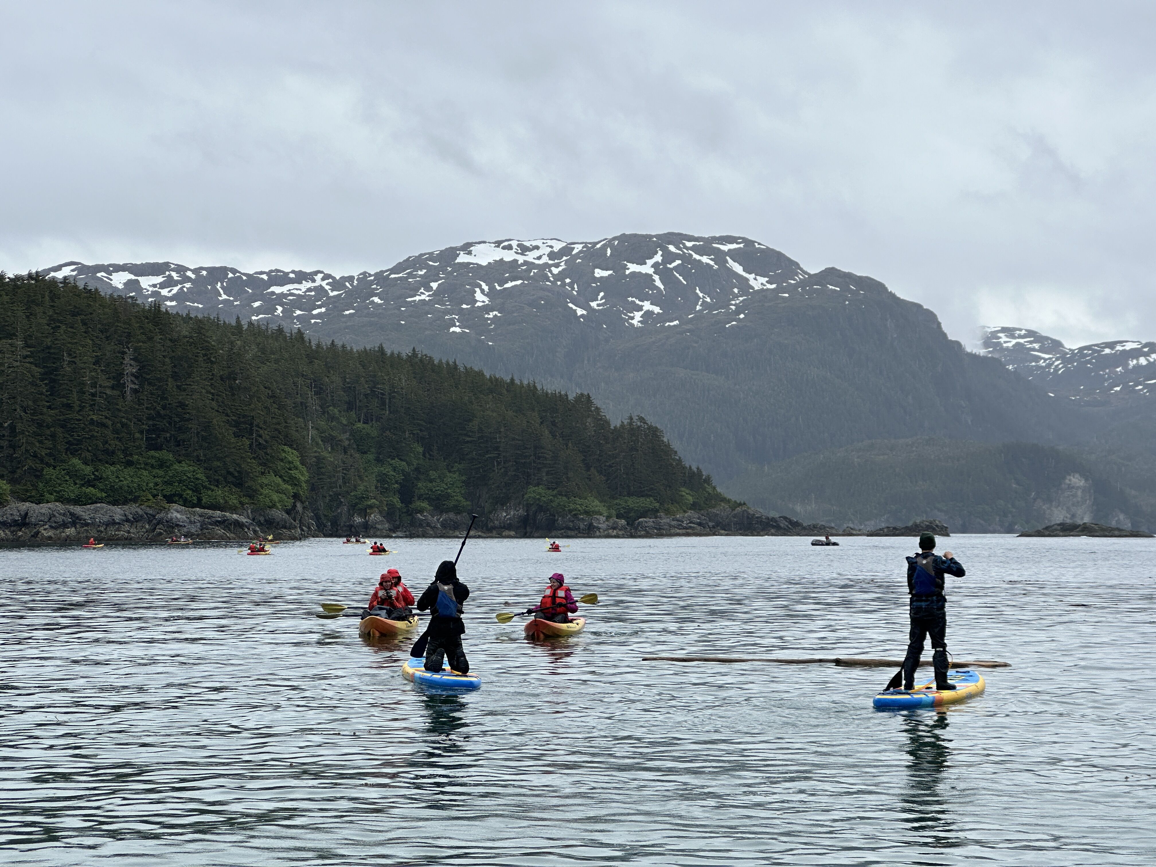 Today was a busy day full of fun adventures. We had a beautiful morning on George Island. Half of our group set out on kayaks and paddleboards, and we paddled over kelp forests into little coves, exploring the sea stars, mussels, and anemones of the rocky intertidal. The other half of our group hiked through the lush forest, across the island to the site of a WWII canon perched at a tall lookout, paying homage to a time when there was fear of military invasion in this part of the world.