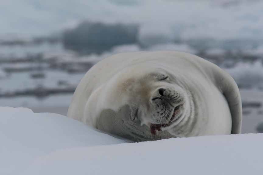National Geographic Resolution spent the day surrounded by icebergs and sea ice in Crystal Sound as the weather got sunnier throughout the day. Guests experienced Detaille Island during the morning activities. Everyone went on guided Zodiac rides around the island where we saw numerous crabeater seals and icebergs. We stopped to observe an Adelie penguin colony, including dozens of penguins waiting to jump in the ocean. Many people went on shore to see the historic research hut from 1956-58, including all the original canned food and equipment kept in pristine condition. Some guests climbed the snowy hill to see the top of the penguin colony across a deep ravine. In the afternoon, the ship cruised around Crystal Sound so we could see the sea ice, glacial icebergs, and huge tabular icebergs. There were beautiful blue sea caves and arches in many of the icebergs, as well as dozens of crabeater seals on the sea ice. However, two humpback whales stole the show when they appeared in the sea ice near the ship. We could hear their loud exhaling and see them diving up close. The rest of the day was spent relaxing, enjoying a presentation, cocktail hour, recap, and dinner as the sun showed brightly in the west. What a perfect day to end our awesome week in Antarctica.