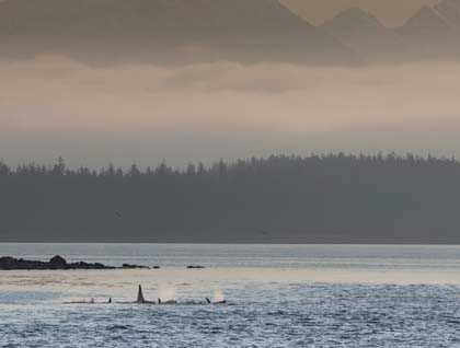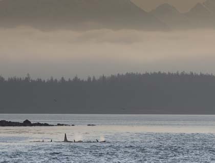 With this trip already filled with so many highlights, expectations were high for sightings of species we’ve yet to spot. Orca of course topped that list, and before breakfast could even be served, the call of “ORCA!” announced that killer whales were just off our starboard. The daily questions of, “Will we see any orca?” have been answered in the affirmative. A small pod, perhaps a dozen strong, swim slowly south hugging the mainland beach, their puffy spouts glistening in the morning sunlight. At least two bulls were escorting a pod that included a few mother and calf pairs. One of the mothers surprised us when she surfaced just in front of our bow with her small calf following close alongside. It was, for many of us, as close as we have ever been to an orca.