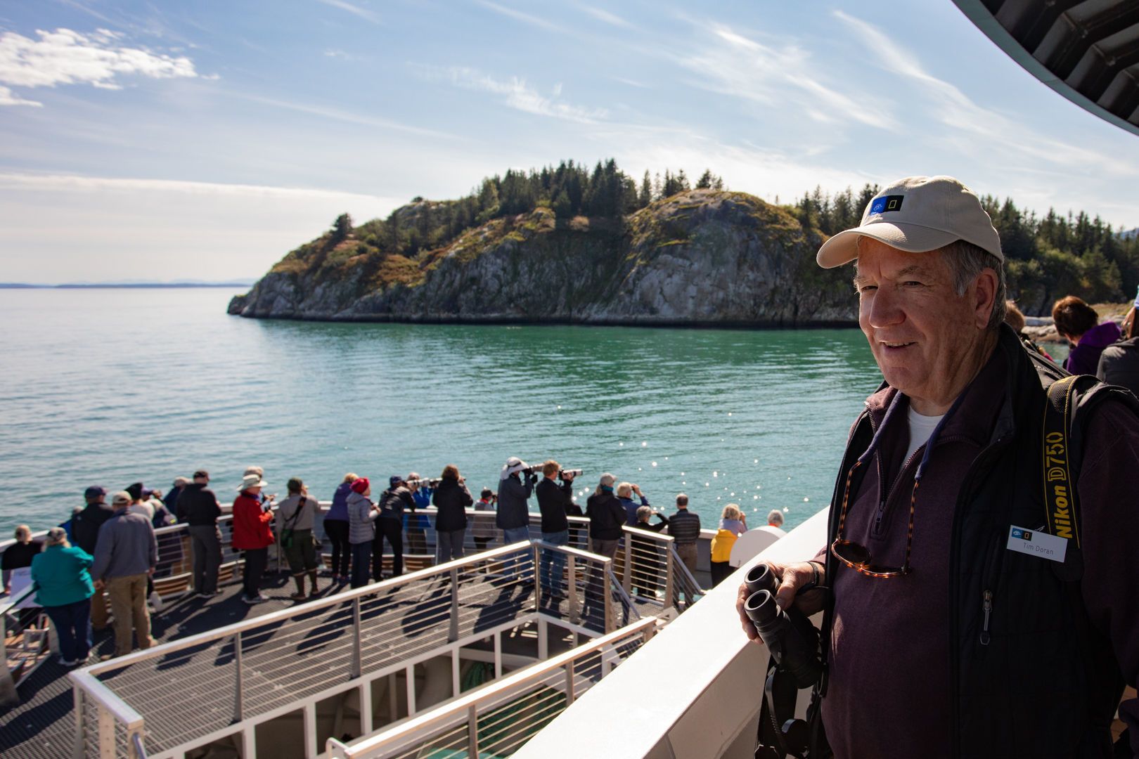 Johns Hopkins Glacier is one of the last remnants of the magnificent ice sheet that covered all of Glacier Bay National park when John Muir arrived here nearly 150 years ago. Many of us awoke this morning to the subtle thud of ice chunks against the hull of the ship, and the glint of Johns Hopkins Glacier in the early sunlight. A fresh chill off the wall of ice looming a quarter mile ahead of the ship permeated morning stretch class, and photographers warmed their lenses on the bow. Our National Park Service Ranger Patrick Otero, and Alaska Native Voices Interpreter Kevin Skeek took the lead on our natural history and cultural education this morning. They shared both their personal and professional stories and perspectives on this unique environment, which is a nexus for issues of heritage, policy, reconciliation, and regrowth.