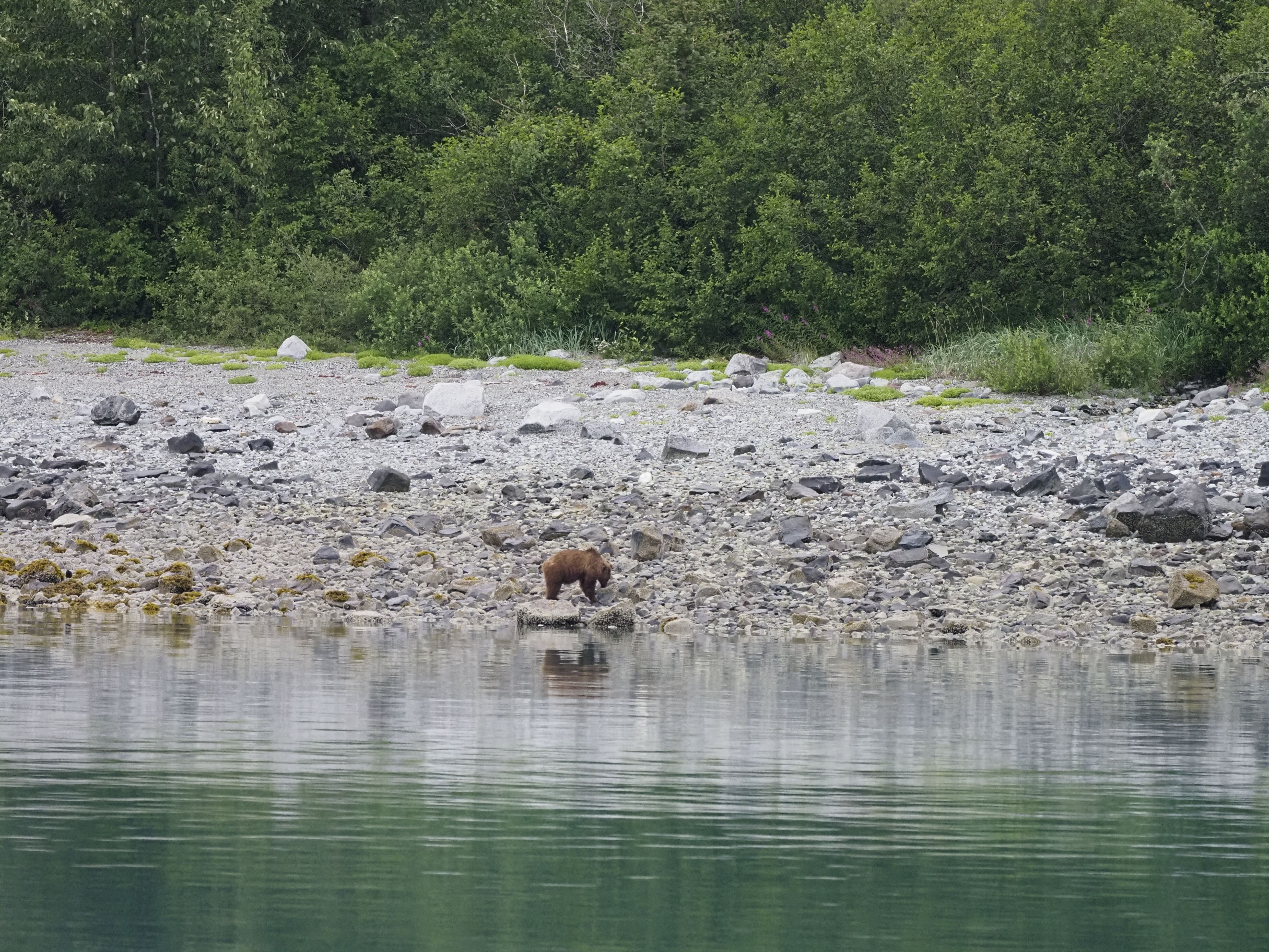 With sleepy eyes and coffee cups and hot beverages in hand, we began our day on National Geographic Quest in Glacier Bay with a delightful sighting of a brown bear. The bear meandered slowly along the shoreline, enjoying barnacles here and there as an early morning snack. Guests were able to observe the bear’s feeding behavior, and the rain did not put a damper a great start to the day!