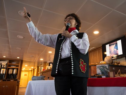 As stories passed down over the generations relay, the late 1600s was a time of glacial advance here in Glacier Bay National Park. This massive fjord system, as we saw it today, however, did not exist in the 1600s. The 65 miles of silt-laden water we transited overnight to get to the northernmost reaches of the park were filled with advancing glaciers and salmon-rich streams when a group of Tlingit natives lived at the foot of those advancing glaciers. Their homes were on land that has since been ground down and flooded by hundreds of feet of seawater as the glaciers retreated. Today we floated over their ancestral homeland, aboard National Geographic Sea Bird, with an extended family member of those early Alaskans. Alice Haldane was one of our guests today and, as a member of the Tlingit community, was aboard to share with us some of the stories passed down by her people over the generations.