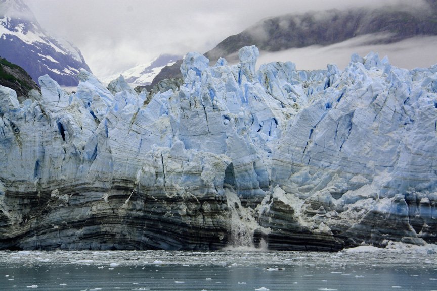 National Geographic Sea Lion entered Glacier Bay National Park at midnight, having picked up Ranger Caiti and Cultural Interpreter Jno at Gustavus earlier in the evening. We motored 65 miles to the head of the West Arm of the bay, Tarr Inlet, overnight, and awoke in front of beautiful Margerie Glacier, an active tidewater glacier. We might have missed the other nearby glacier, the Grand Pacific, had we not been made aware of the dark, rubble-strewn mass of ice that once filled and carved Glacier Bay and now blocked further passage. We had arrived at the northernmost extent of our voyage. We listened to Margerie in silence and awe, impressed at being so close to a 21-mile long river of ice a mile wide and 250 feet above the water at its terminus. She rewarded us with pops, crackles, and roars as new icebergs were born.