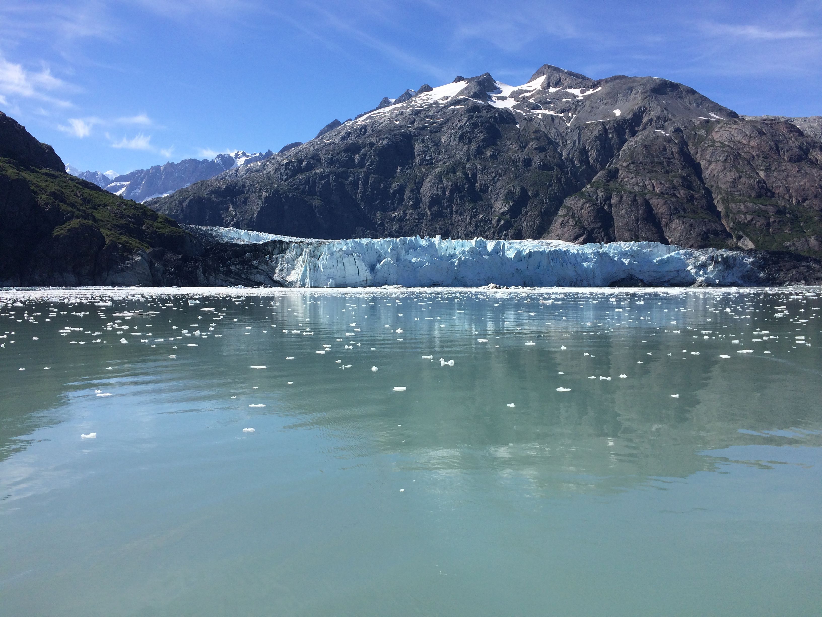 Further north we approached Gloomy Knob, where mountain goats dotted the cliffs. The killer whales joined us again and traveled alongside the ship and then passed us up to take the lead. After lunch we had arrived as far as the waterway could take us – to Margerie and Grand Pacific Glaciers. Although the Grand Pacific is sprinkled with dirt and rocks, it still overlooks the glacial valley it has carved over the past 250 years. Margerie Glacier, to the west of the Grand Pacific, is fed by the river of ice from Mount Fairweather – visible today just beyond the face of the blue calving glacier.