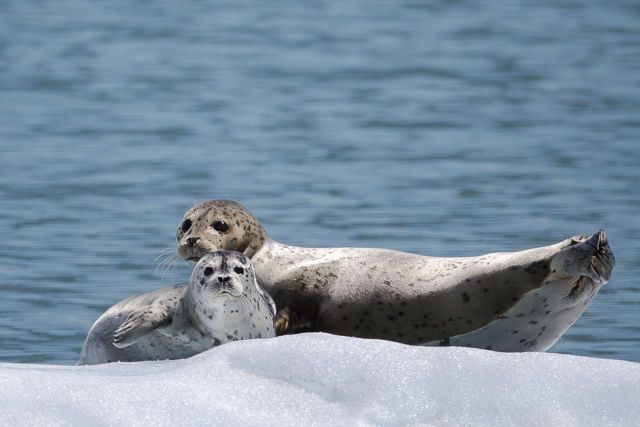 As we continued our journey to the northernmost part of the bay, we spotted some mountain goats and a solitary brown bear that was enjoying the sunshine up high in the mountainside. A couple of humpback whales and many sea otters were discovered as well; numerous harbor seals were seen sunbathing on ice floes, looking at us with their huge eyes as we sailed past them. However, it was the impressive view of the glaciers that made our day. First the Lamplough, then the John Hopkins, and finally the Margerie and Grand Pacific Glaciers regaled us with their grandeur and amazing colors. At the Margerie Glacier we had the chance to witness some great calving that helped us understand the whole process of change and rebirth that make Glacier Bay such a spectacular place.