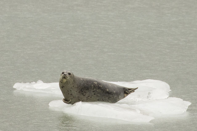 Another brown bear was discovered walking by itself along the beach, not far from the aptly-named Gloomy Knob where we found a small group of mountain goats. Then we headed towards the Lamplough Glacier and the John Hopkins Inlet. There we encountered more and more ice floating around and numerous harbor seals on larger floes; the vicinity of the John Hopkins Glacier is a well-known breeding and feeding area for the harbor seal. But the majestic glacier really impressed us with its mile-wide bulk, subtle colors and textures, and marked the climax of a marvelous day in Glacier Bay National Park.