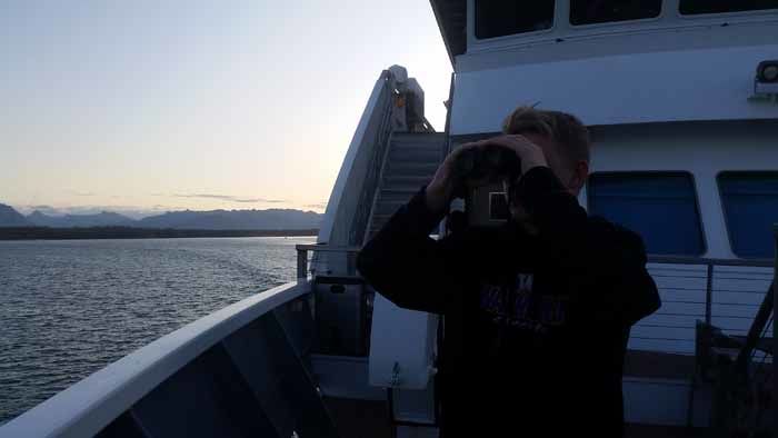 What is a day in the life of a Global Explorer in Alaska like? If it’s a sunshiny day in Glacier Bay National Park, it starts early! While the sun is still rising, we pick up a special guest in Bartlett Cove: a National Park Service Ranger! On the bow in a brisk dawn, we begin a journey Up Bay, on the lookout for wildlife and fun. The day has yet to behold the wonders of pristine wilderness: rainforest, glacial fjords, mountain goats, brown bears, harbor seals, tidewater glaciers, and the joy of experiencing all with family and friends.