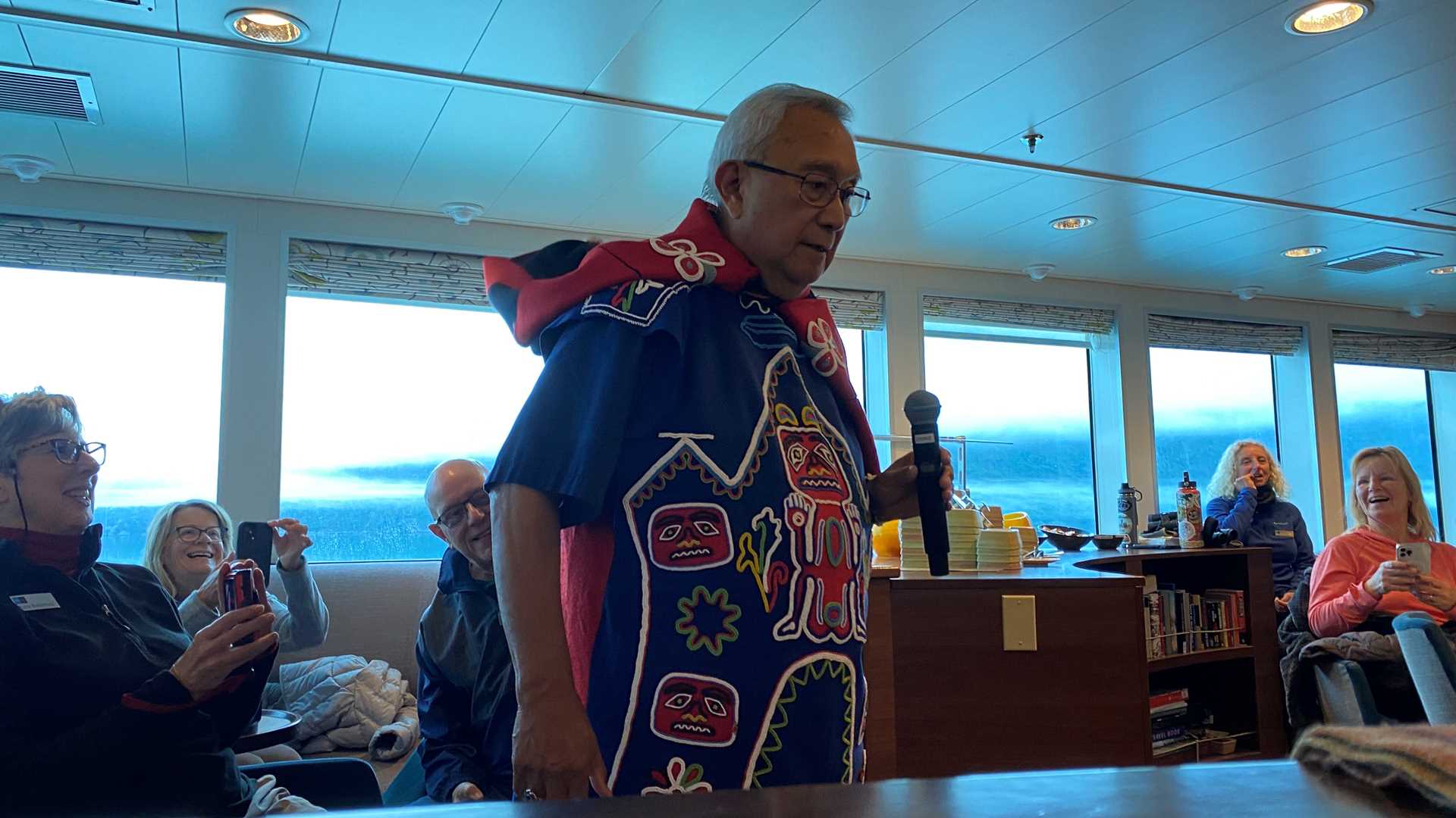 At 0830 our cultural interpreter, James “Uncle Jim” Thomas, sang a traditional Tlingit greeting song and regaled us with stories of his people. I have seen many people tell great stories and impart fantastic lessons in the lounge of National Geographic Quest, but I don’t think I have ever seen anyone get as many laughs as Uncle Jim. Jim’s stories had me wheezing with amusement and smiling with inspiration. It is truly a testament to Lindblad Expeditions-National Geographic that such fascinating people come to speak to our audiences.