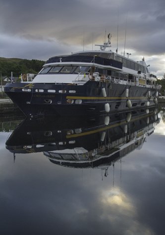 The vessel entered fjords filled with bergy bits and growlers as we cruised up the bay. We first passed Lamplugh Glacier resting on the low-tide shoreline as a river of glacial melt flowed out its central ice cave. We then progressed to Johns Hopkins Glacier, which was bordered by towering steeply carved and polished walls of stone. Intense sounds of glacial ice cracking and echoing thunder from massive calvings were heard while at Margerie Glacier. The Grand Pacific Glacier was covered in deep layers of moraine, looking almost like a mountainside itself and not the great glacier that hid beneath.