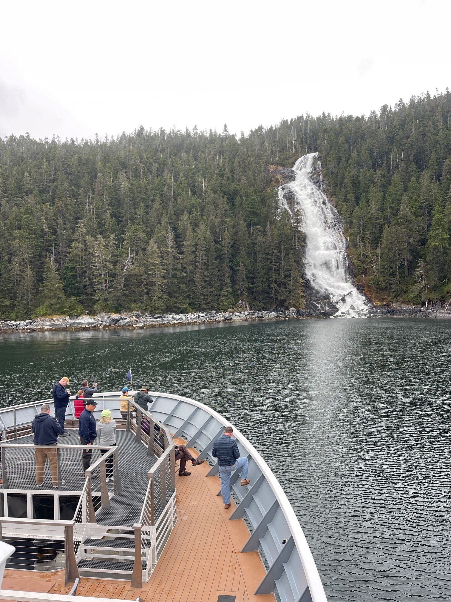 As the afternoon progressed, we ventured farther through Glacier Bay and were rewarded with an awe-inspiring encounter with lunge-feeding humpback whales. The weather may have been rainy, but the sight of these magnificent creatures more than made up for it. The humpback whales gracefully arched their massive bodies, propelling themselves through the water to capture shoals of fish before plunging back down into the depths.