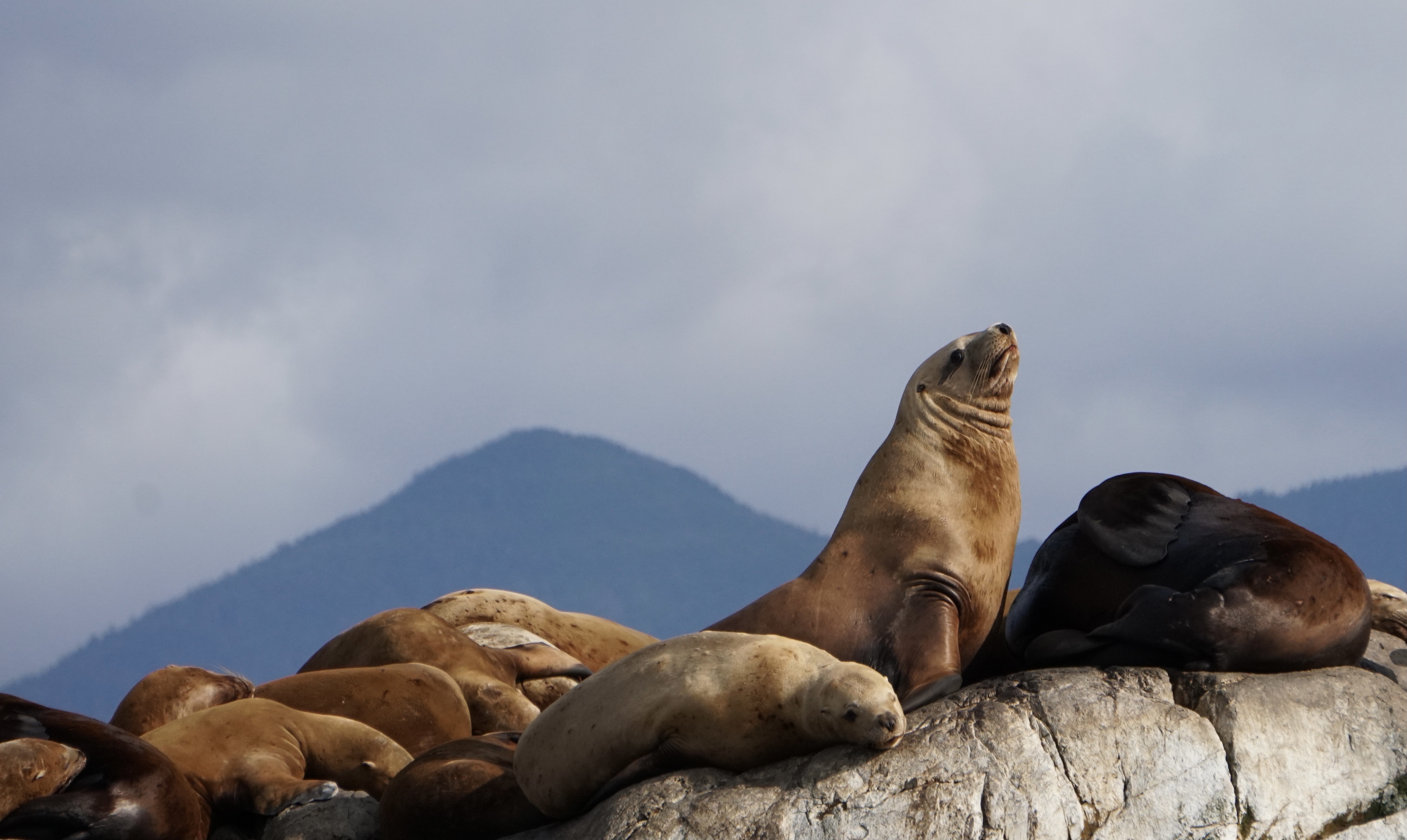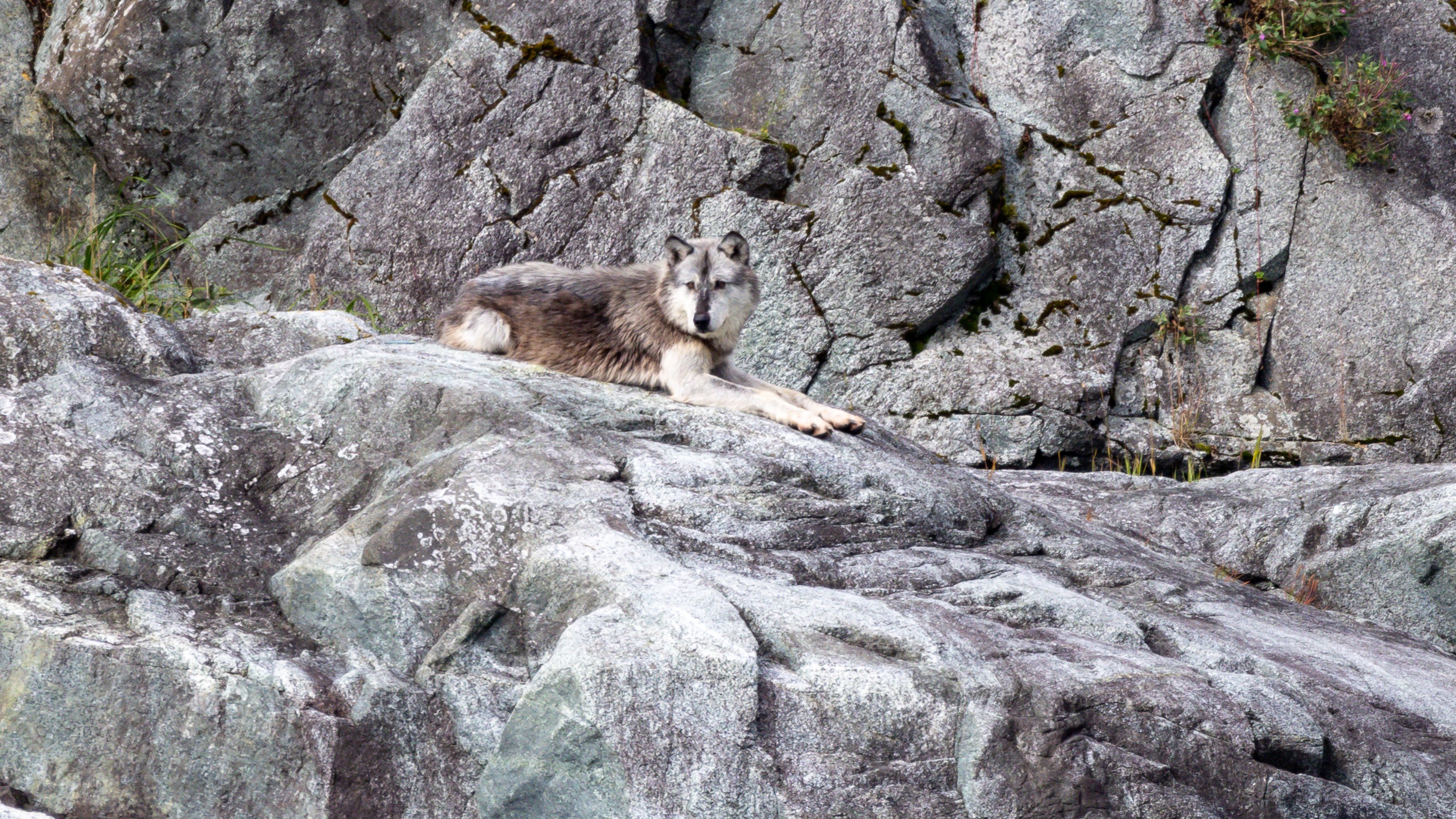 They say you need “fair weather” to see the Fairweather mountain range in Glacier Bay, and we got better than that with almost clear blue skies and mountains peeking out through a thin layer of clouds. We started our exploration of the Glacier Bay National Park at Johns Hopkins Glacier seeing the immensity of the landscape from sea level up to the 15,300 feet peak of Mount Fairweather. Then it was onto Margerie Glacier where the little ice floes sparkled in the morning sun. However, the real treat was yet to come. As we traversed through Russell Cut, a lone gray wolf sat patiently on the shore of Russell Island as everyone got photos. On the opposite shore, a female coastal brown bear and its cub was spotted so we went to safely investigate while they meandered along the shoreline. After lunch we slowly drifted by South Marble Island, hearing the grunts of Steller sea lions and watching the tufted puffins fly in and out. To finish the day, we moored at Bartlett Cove and stretched our legs with some hiking into the forest admiring the porcupines!