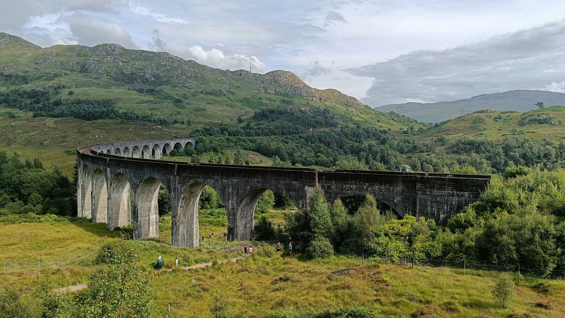 Our other reason for visiting this site is the viaduct across the way, which is the longest concrete railway bridge in Scotland and carries the West Highland steam railway. The viaduct and the steam train were more recently made famous as Hogwarts Express in Harry Potter films. At this time of year, the hillside is colored with bell heather.