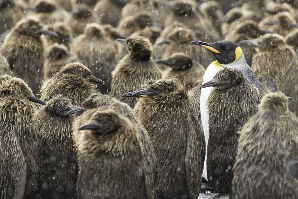 Today was International King Penguin Day! Well, not officially, but it certainly felt like it—it was a fantastic king penguin festival for those of us exploring South Georgia on the National Geographic Explorer. Our morning landing was at Gold Harbor, a gorgeous bay near the southern end of the island, which is backed by rugged mountain peaks and the Bertram Glacier, a river of ice that tumbles down a near vertical cliff behind the beach, and, in the midst of all, a colony of 25,000 pairs of king penguins. But this was just the appetizer. In the afternoon, we made a successful landing at St. Andrews Bay, the largest of all the king penguin colonies on South Georgia—home to over 250,000 pairs of these amazing birds! And to top it all off the wind switched to the south and the skies cleared, making the day even more beautiful.