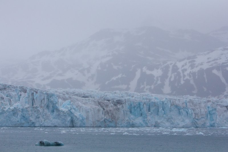 Later in the morning, Plan C materialized as we spotted some whales and it was time to enjoy a bit of whale watching. Two humpbacks were feeding on krill just below the surface, spending long periods of time at the surface. One of them had a very interesting tail as part of the left tip was missing—probably the result of an encounter with killer whales. Then it was back to Plan B as we cruised close to the glacier at the end of Cumberland Bay. Nordenskjöld Glacier is at least a mile wide with a towering face. Many icebergs were floating in front of the face, and the glacier disappeared far into the mist and fog. This was a very nice alternative for sure.