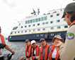 Today was, more than anything, the great king penguin day! A good number of early risers who had responded to Expedition Leader Peter Wilson´s wake-up call at 4:45 a.m. were set ashore on Gold Harbour. The weather was overcast with a light snowfall. This site is one of South Georgia´s most spectacular landing spots and resembles an amphitheater, with a wide, flat beach framed by lush slopes, steep rocks, and a glacier. The beach is home to a large colony of king penguins, fur seals, and elephant seals. Those who got up at normal wake-up time were shuttled to the beach just after breakfast, and we all spent the morning ashore.