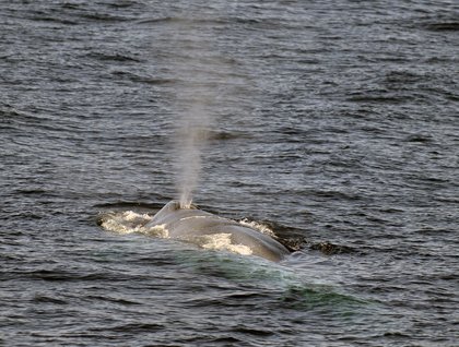 We also adjourned to the dining room for our first meal of the day, followed by a lecture in the forward lounge on marine mammals, given by one of our natural history staff. As Carlos was about midway through his talk an announcement was made...humpback whales, humpback whales...come to the bow! Our entire group made their way to the bow to be greeted by a cow/calf pair of humpbacks. Looking out to sea, a much larger group of animals was spotted and soon the National Geographic Sea Bird was changing her course and heading out to spend some time with quite a large group of competitively active humpback whales. Tail lobbing, head lobbing, flippers splashing, full body throws onto another whale, all of which was happening at a speed of 7 knots. This group of approximately 10 or 12 animals continued to make a zig-zag pattern back and forth in an area called Gorda Banks, well-known for humpback whale activity. For nearly two hours we continued watching this group of humpback whales, as one after another the whales would surface, breath very deeply and then charge out again at each other. The dorsal areas of many of the animals were bloodied and with one closely passing the National Geographic Sea Bird we could see the 15 foot flippers under the water, hear the intense blows and watch as this large group of whales charged past us.