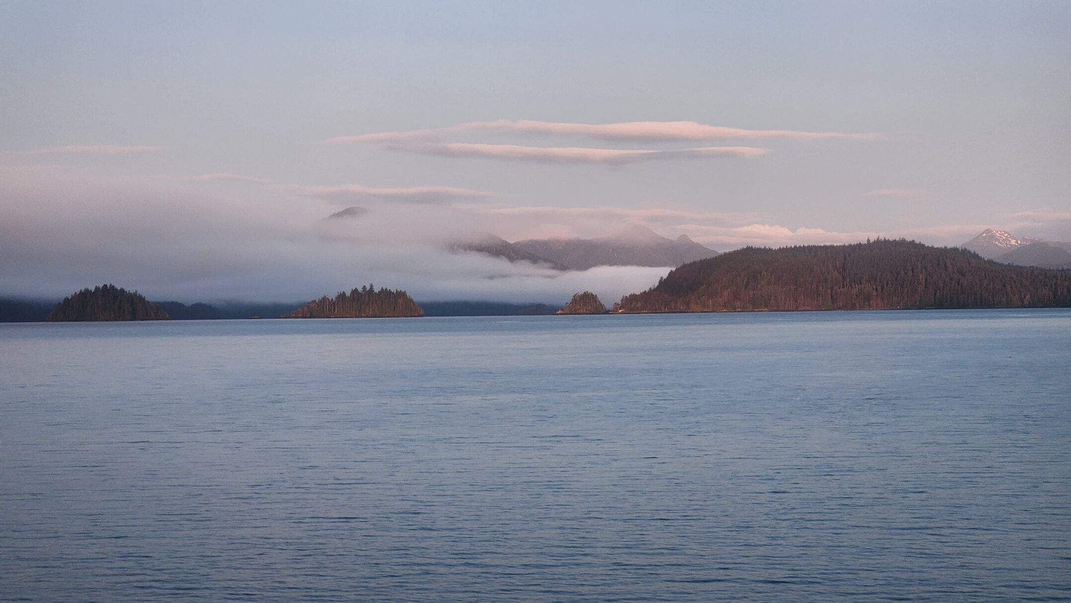 Our last lovely day in the Great Bear Rainforest was full of excitement, education, and awe. After dropping anchor in the idyllic glacier fjord of Green Inlet, we set out to explore the rocky shoreline and forested granitic fjord walls. The dense fog gradually turned into a wispy mist which exposed different peaks and corners of the forest as it moved through. We took turns kayaking through a delightful cove that was loaded with ochre sea stars, rockweed, and blue mussels so thick and dense the rock they were attached to was hardly visible between them. A river otter scurried along the shore and bald eagles soared above us.