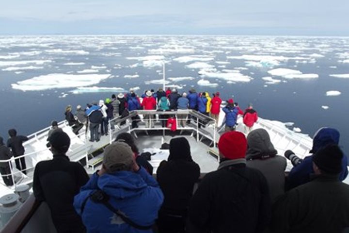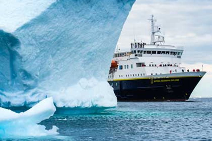 Every day of an expedition is exciting, but we all knew today in Greenland would be special. First thing this morning, National Geographic Explorer encounters the huge icebergs calved from Jakobshavn, one of the largest and most active glaciers in the world. If you’ve seen the movie Chasing Ice by National Geographic photographer James Balog, this was the glacier captured on film calving an iceberg the size of Manhattan. The ship navigates through the ice before anchoring offshore Ilulissat, the small settlement that translates to “The Icebergs.” It’s easy to see why this area is a UNESCO World Heritage Site. Towering icebergs block the entrance to the fjord, with the active face of the retreating Jakonshavn, now more than 40 miles from the entrance. The icebergs here are on a scale rivaled only by the ice in Antarctica. It’s a busy day coming and going from the ship, with options for walks in town, a hike out to an overlook of the ice-choked fjord, boat tours with local captains among the icebergs, a Greenlandic food tasting, and flightseeing operations to the Greenland icecap. Words can’t really describe how spectacular the icebergs are, or how interesting the light was in the afternoon. For that you need images. Taking advantage of the perfect conditions, a helicopter was made available to photograph the ship navigating through the ice. With the evening recap cancelled, and cameras and cocktails in hand, it was all hands on deck with proper dress for this spontaneous photo opportunity. It’s events like this that make traveling on National Geographic Explorer a true expedition, and also an unforgettable experience.