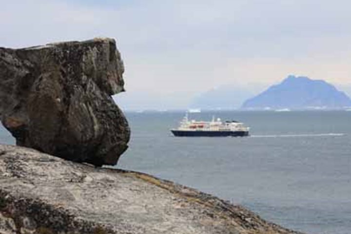 We had a marvelous start to our day. Not long before breakfast a number of fin whales were spotted not far from the ship. Nicknamed the “greyhound of the sea” because of the speed they usually swim at, they are the second largest species of cetacean and we were treated to a truly amazing close-up sighting. Our morning activities concentrated on an exploration of the remote western coastline of Greenland in the area known as Qilakitsoq. The name means “the sky is low” and is a reference to the common occurrence here of fogs. After breakfast we made a shore landing on a pebbly beach that forms the entrance to a small semi-circular, low-lying grassy hollow. For centuries Thule hunter-gatherers lived here exploiting the rich marine resources of the area. Remains of a number of their sod- and stone-built winter dwellings and summer tents have been located, in addition to middens or refuse layers. The butchered bones of narwhal, beluga, seal, walrus, polar bear, ptarmigan, and dovekies have been identified and give us an insight into the diet of the inhabitants of this small community, which would have numbered around 30 people. Qilakitsoq is famous as the find spot of one of Greenland’s most important archaeological discoveries, namely eight ancient Thule mummies. Two ptarmigan hunters in 1972 noticed an unusual pattern in the stones lying beneath a rocky overhang and on closer inspection found the cache of mummies. They immediately notified the authorities but it was a further five years before the site was archaeologically investigated. The mummies were clad in full winter clothing made from seal and caribou skins and were interlayered with sealskin blankets. In Thule tradition it was believed that the journey to the next life was a long and cold one and so they had been well prepared for this. The mummy which caught the public’s attention was that of a six-month old child clad in sealskin anorak and pants. The mummies appear to have been buried over a period of time and specialist examination of the remains failed to ascertain the causes of death. They have been dated to around 1475 A.D. and four of the best-preserved are at present displayed in the National Museum in Nuuk. Many of the guests made their way down along the scree slope to the overhang to see the actual gravesite and explored the remnants of the ancient hunter’s camp. In addition there are a number of small stone-built graves containing the skeletal remains of erstwhile members of this Thule community who eked out a livelihood along this remote and inhospitable northern coastline over 500 years ago. In the afternoon there were a number of presentations in the lounge, which detailed various aspects of the area as the National Geographic Explorer made its way toward the coast of Canada across Baffin Bay.