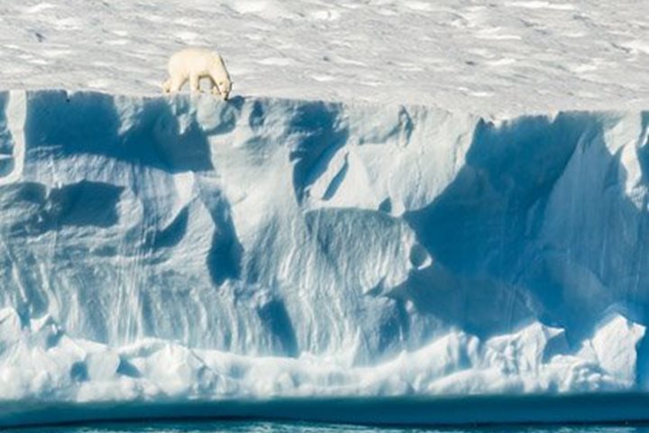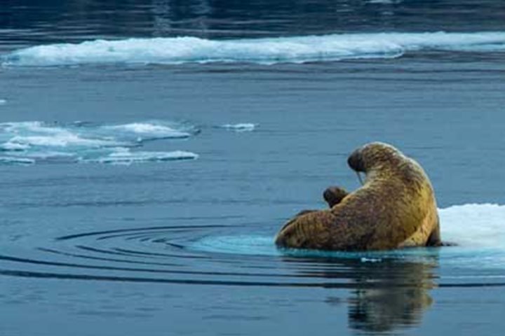 Leaving Baffin Island in our wake National Geographic Explorer arrived early morning in Lancaster Sound. This famous stretch of water was the route along which Sir John Franklin sailed his two ships, HM S Erebus and Terror , with a total crew of 129 men, in late 1845 on their ill-fated expedition to find the elusive Northwest Passage. Not a single man survived to tell the tale of this tragic adventure which exacted such a high price in human life. The waters of Lancaster Sound lap the southern shores of Devon Island where we spent the entire day observing a wide array of Arctic wildlife. Tracking along the coast, our first sighting was two walruses lying beside each other on a small ice floe. These are gregarious and tactile creatures. Their latin name is Odobenus rosmarus , the former meaning “tooth walker,” deriving from the animal’s ability to haul itself onto ice floes using its two tusks. Highly sensitive whiskers locate molluscs living in sediment on the sea bottom. Interestingly one of the animals was missing one of its tusks. These canine teeth have been much prized for centuries. In Medieval times Viking traders, who plied these waters brought walrus tusks to Ireland, Britain, and Mainland Europe. Here they were fashioned by highly skilled craftsmen into a variety of high status items. Harp seals were present in abundance with groups at a time surging in the water among the ice floes. In addition a large bearded seal reclined on a floe and “posed” for photos. But the best treat was what we thought was a lone walrus on a chip of ice, but as we got closer, the tiny head of young calf emerged from the mother: walrus Madonna and Child! Later on in the morning we headed into the broad sweep of Maxwell Bay. The cliffs here form a dramatic backdrop of alternating strata of ancient siltstones and sandstones dating back some 500 million years. Impressive scree slopes of shattered rock fragments were banked up along its base. The process of freeze-thaw, which causes the rock to flake and shatter, is responsible for the accumulation of these fan-shaped deposits. Thick-billed murres whirred through the air as our ship manoeuvered through the fast ice which was veritably peppered with ringed seals. And hunting these were a number of the king predator of the Arctic—polar bears. A female with her two cubs was particularly captivating. Hunkered down close to seal breathing holes, bears patiently waited for a chance to catch a meal. An azure sky was reflected in the leads through the ice. So an all-round fantastic expedition day of exploration and wildlife engagement on the remote shores of Devon Island in the Canadian Arctic.