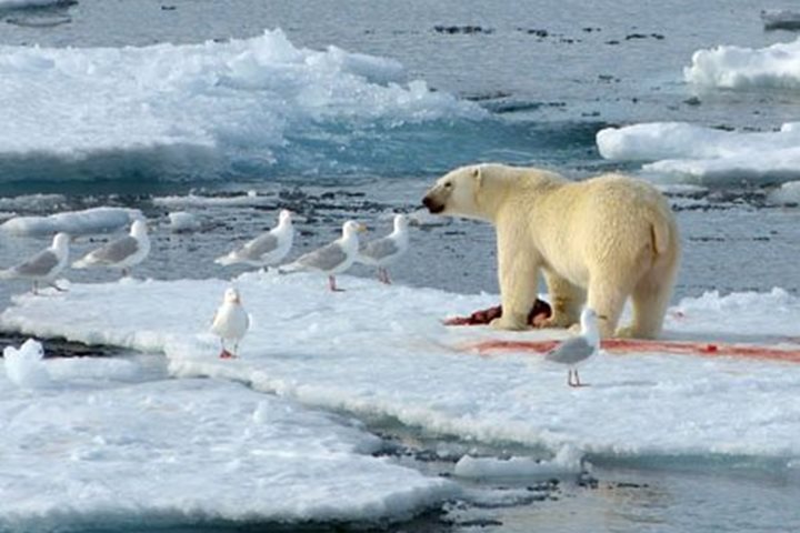Nobody - not even the most extravagant of brochure writers - could have anticipated the number of polar bears that we have encountered along the coast of Baffin Island. We are always watching from the bridge of National Geographic Explorer , with a friendly competition between crew and natural history staff to be the first to spot a white dot on the hillside. Sometimes the dot transforms into a white rock. We have a laugh at ourselves and move on. But at other times, the white dot is a sleeping polar bear. It rouses, and ambles over the tundra or clambers over the boulders, a picture of languid grace. It is preserving energy to see it through the summer and into the season of plenty, when sea ice forms and it can hunt for ringed seals. This morning, however, our ice chart led us to a patch of residual sea ice, a remnant of last winter's frozen sea that has drifted south with the Labrador Current. Here we found a polar bear with the product of a successful hunt. It takes patience for a polar bear to hunt the seal, and it takes patience for our bridge officers to bring the ship, ever so slowly, into optimal viewing and photography range. It all came together this morning for a superb wildlife experience. Our bear seemed to be a young male, perhaps entering the prime of life (judging from the thick neck but with little scarring around the face that comes from battles with other males), and in good condition (judging from the well-rounded body.) Perhaps it had been drifting south with the ice. It had been feeding on the seal for some time. The layer of blubber is the first, and sometimes the only part of the seal to be consumed, and it was gone. The bear was sharing its kill with twelve or more glaucous gulls. It was well aware of us, but reluctant to abandon its kill. We left the scene. On the shore of Padloping Island, even within sight of the patch of sea ice, we spotted a bear ... and then another, and then more. Seven polar bears were clearly visible. High on the hillside above us was a female with two large, yearling cubs, lounging near a patch of bright magenta dwarf fireweed. Why was she so far above potential feeding areas? We speculate that she was avoiding the male bears that are a risk to her young, but soon she will have to find a meal, for the cost of lactation to provide for the needs of her two large cubs is high.
