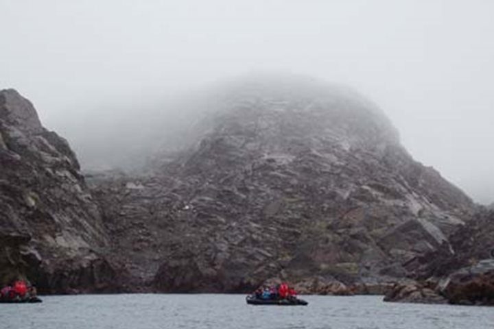 We spent the morning exploring the Lower Savage Islands, which are located just off the south-eastern tip of Baffin Island. Although aboriginal peoples are known to have inhabited these islands (at least seasonally) for hundreds of years, the first Europeans to note the islands were Robert Bylot and William Baffin aboard the ship Discovery in 1610. Because of their strategic location near the mouth of Hudson Bay, these islands became the site of an annual trading fair between the Inuit and the Europeans that continued for nearly three centuries. This dramatic and well-named archipelago consists of three main rocky islands stretching approximately eight miles in length with about the same distance in width. The islands are separated by long, narrow, steep-sided channels, which make them perfect for exploring by Zodiacs. Conditions seemed far from ideal when we first arrived, because it was foggy and drizzling, but the first intrepid group to go cruising found the inclement weather actually added to the mystery of the islands and produced some nice photographic possibilities. So, why the moniker Savage? The first Zodiac to enter into the channel at the north end came upon a polar bear meandering about on the rocky slope. We had not planned any landings here, and the bear simply reinforced that thought. Without landing to examine rocks closely, the geology of the Lower SavageIslands is a bit difficult to identify precisely, because the surface rocks are heavily affected by staining and/or coverage by lichens, mosses, etc. The islands appear to be either granitic or gneissitic in nature. They may actually be a combination of both, meaning some areas are simply exposed intrusive igneous material, i.e. granite, and other areas are exposed metamorphosed material, perhaps granite that has been changed into gneiss through the effects of intense heat and pressure. There is some obvious banding or foliation typical of metamorphism, but there is also much evidence of exfoliation, a process by which relatively thin layers of rock peel off from granite surfaces that occur from pressure release when the overlying burden is eroded away and the surface expands. Hydrothermal vents must have been active here in the distant past, judging by the impressive coatings of rust and sulfur compounds that seem to have emanated from many of the cracks. The geology has also been affected by glacial carving, judging from the smooth, rounded surfaces in the lower areas. Jagged, angular rocks in the upper regions give evidence of having been severely fractured and broken up by freeze-thaw effects. In the late afternoon, as National Geographic Explorer cruised northward in Baffin Island’s Frobisher Bay, we spotted another loosely organized pod of bowhead whales. What bizarre whales they are compared to our more familiar species. These are massive, rotund animals with huge heads that make up fully one-third of their body length. Bowheads are built for slow filter feeding, but definitely not for speed. Scattered icebergs and distant views of glaciers among mountains off both sides of the ship gave us a most enjoyable cruise during the afternoon and evening as we headed for our final port-o-call…Iqaluit.
