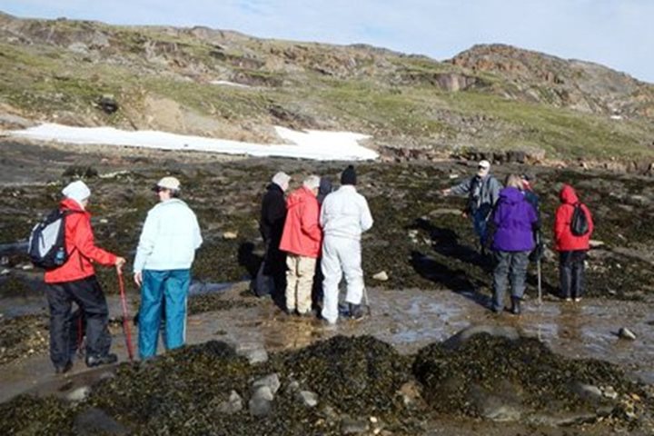 This morning would be our first aboard Na tional Geographic Explorer during our 15-day expedition along the Baffin Island and Greenland coasts. Introductions were done by the natural history staff and information given about what to expect on our walks, hikes and Zodiac cruises as well as how to dress and the importance of staying with our groups in polar bear country. After that we were all decontaminated! This was not as extreme as it may sound. Because traveling in marginal environments can be damaging to them, an inspection was done of outer layers of clothing as well as boots to make sure no introduced seeds or soil would be spread. Later in the morning the photo team gave us some helpful hints for the photographic portion of our expedition. During the afternoon we sailed to a place recommended by our Canadian ice pilot, Ray Jourdain—a small inlet on a small island called Noble Inlet. Just as walks and hikes were being organized, the first polar bear of the expedition was spotted by one of our guests! The bear was napping on land and was woken up by our approach. He quickly settled back into his summer slumber as we learned about the Arctic Baffin Island ecology by the naturalist on shore. Many of the summer flowers were still blooming including the moss campion. Some groups stayed closer to shore and enjoyed learning about the tide pools. Once back on board we all enjoyed the Captain’s welcome aboard cocktail party and dinner.