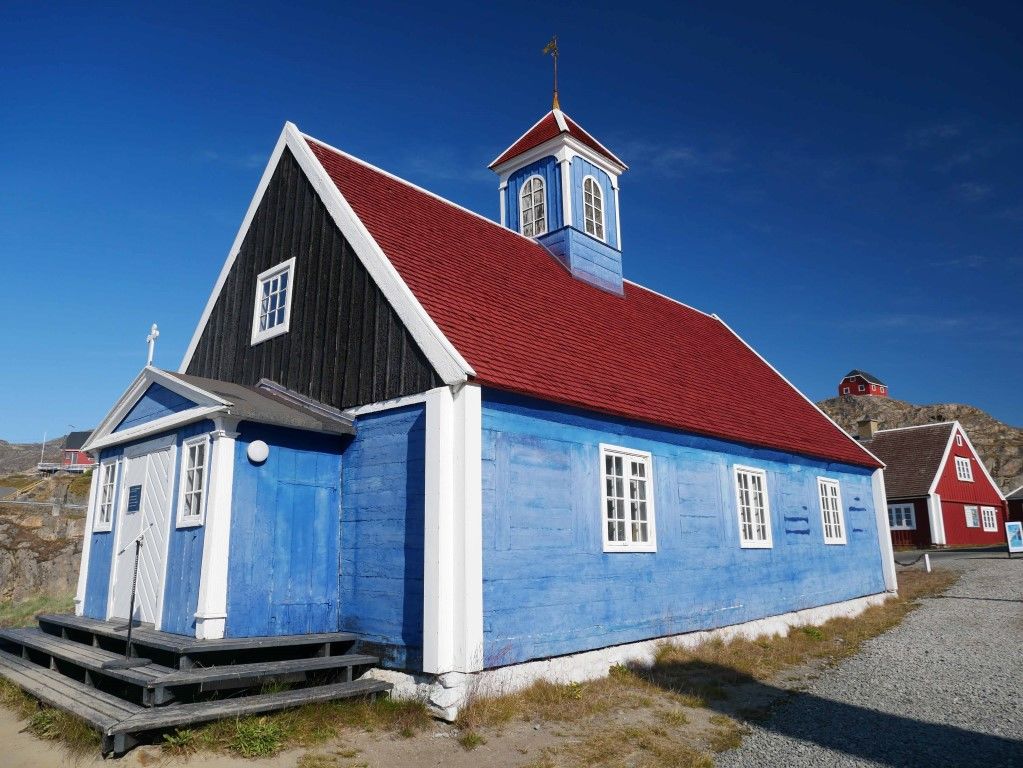 The houses and buildings in Sissimiut look as though they’ve been taken from a typical Scandinavian town—and in fact, some of them were. One church, for example, was built and disassembled in Denmark, then shipped to Greenland. The intervention of government officials was required when it mysteriously became “stuck” in Norway for a year. Unlike the buildings in arctic Canada and Alaska, those in Greenlandic towns are painted in bright colors—typically reds and blues and greens and yellows—that signify their function or the owner’s occupation. Greenlanders build their houses perched on the granite bedrock to prevent them from melting and sinking into the permafrost.
