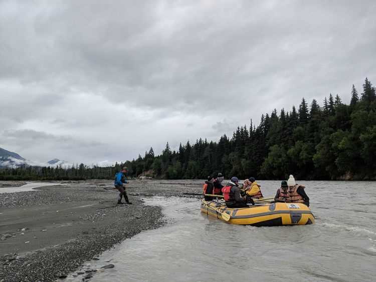 Our small ship was the only one visiting today, in this windswept, white-capped canal. Dressed in rubber boots and raingear, we were able to explore much of what the area has to offer: flying over the surrounding, massive mountains and glaciers; cycling along the Lutak Inlet, where the Chilkoot River flows out of Chilkoot Lake and bears come to feed on salmon; hiking up 1,800 ft. Mt. Riley for panoramic views between the moisture-laden clouds; and floating down the muddy, braided channels of the Chilkat River. It was an adventurous day in what has become known as the Adventure Capital of Alaska.