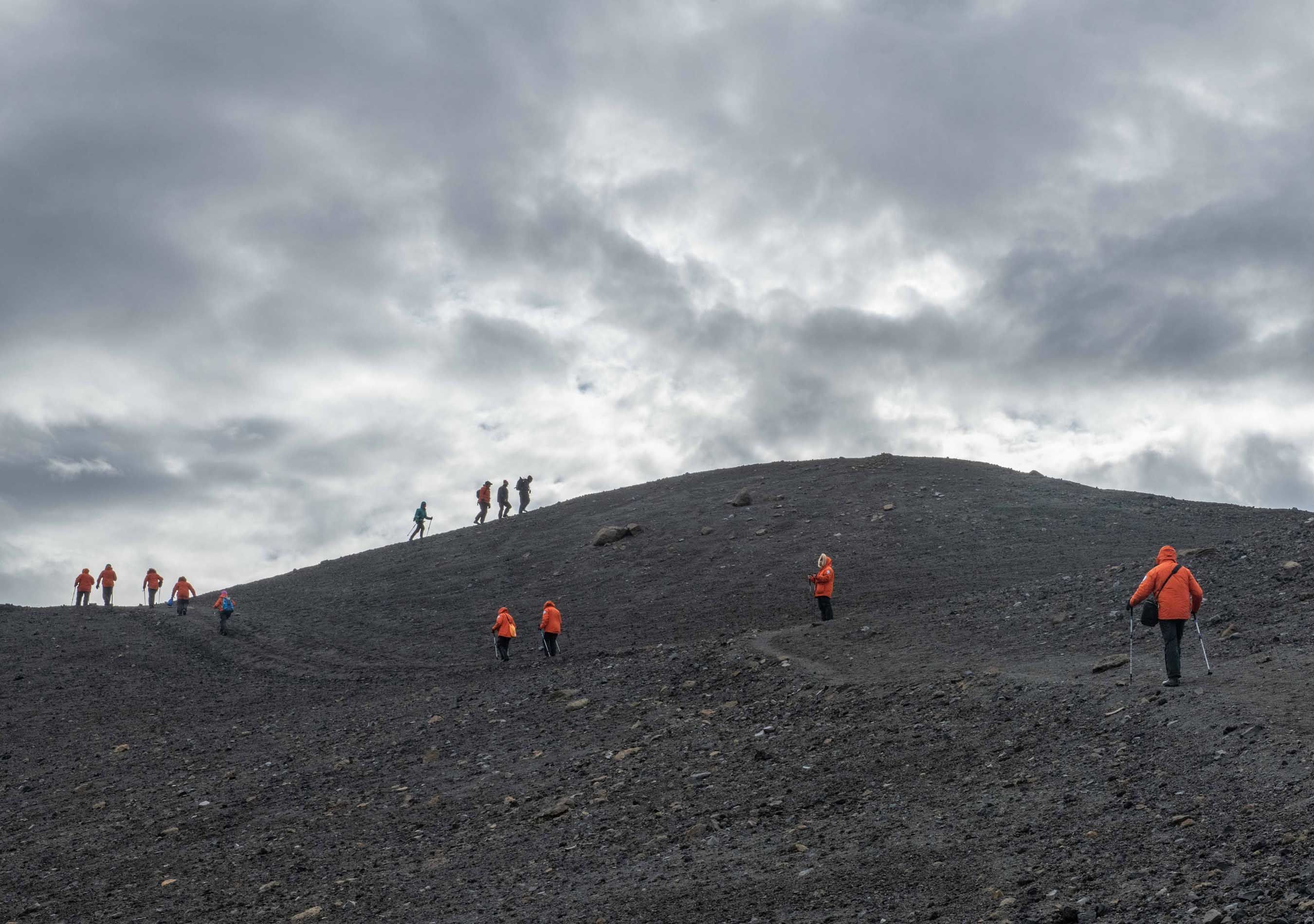 During lunch, the ship moved to our last site of the expedition, Telefon Bay, in Deception Island. We had hoped to kayak here, but as we prepared to lower the kayak platform the wind rose and continued to rapidly increase. Though kayaking was no longer an option, we had an exciting Plan B: from the dark, volcanic shore, guests hiked up to a spectacular caldera, situated at the back of the flat, wide beach. Once up on the caldera rim, the wind was howling, which added to the impressive volcanic scenery that could be seen far below.