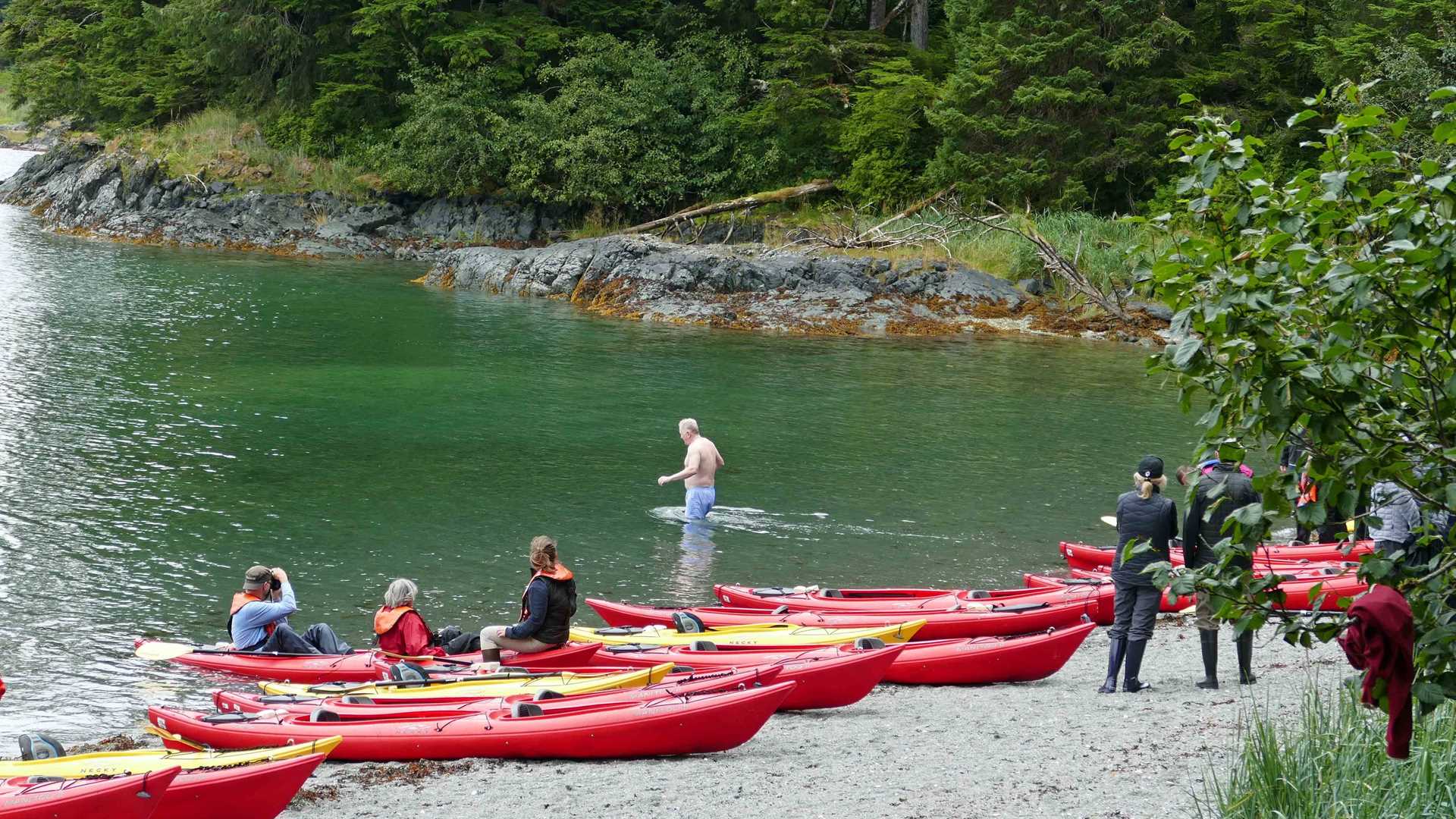 The unceasing delights of Southeast Alaska’s wilderness and wildlife continue to unfold around us every hour of every day. This morning, our hardworking crew festooned the shore with yellow and red kayaks and paddleboards, and we explored this stunning piece of old growth forest by land and sea. In the cascade below Lake Eva, the first group of hikers surprised a mother bear and her cub feeding on spawning salmon. Deeper into the forest, delectable bright yellow-orange chicken of the woods fungi spiraled up the trunks of decaying Sitka spruce trees. Spikes of coral root, a rose-colored orchid, and bright red bunchberries decorated the mosses on the sides of the trail. Kayakers paddled into the bay, a tide dependent estuary where harbor seals and bald eagles were in residence, hoping to catch (or steal) a meal of fresh salmon.