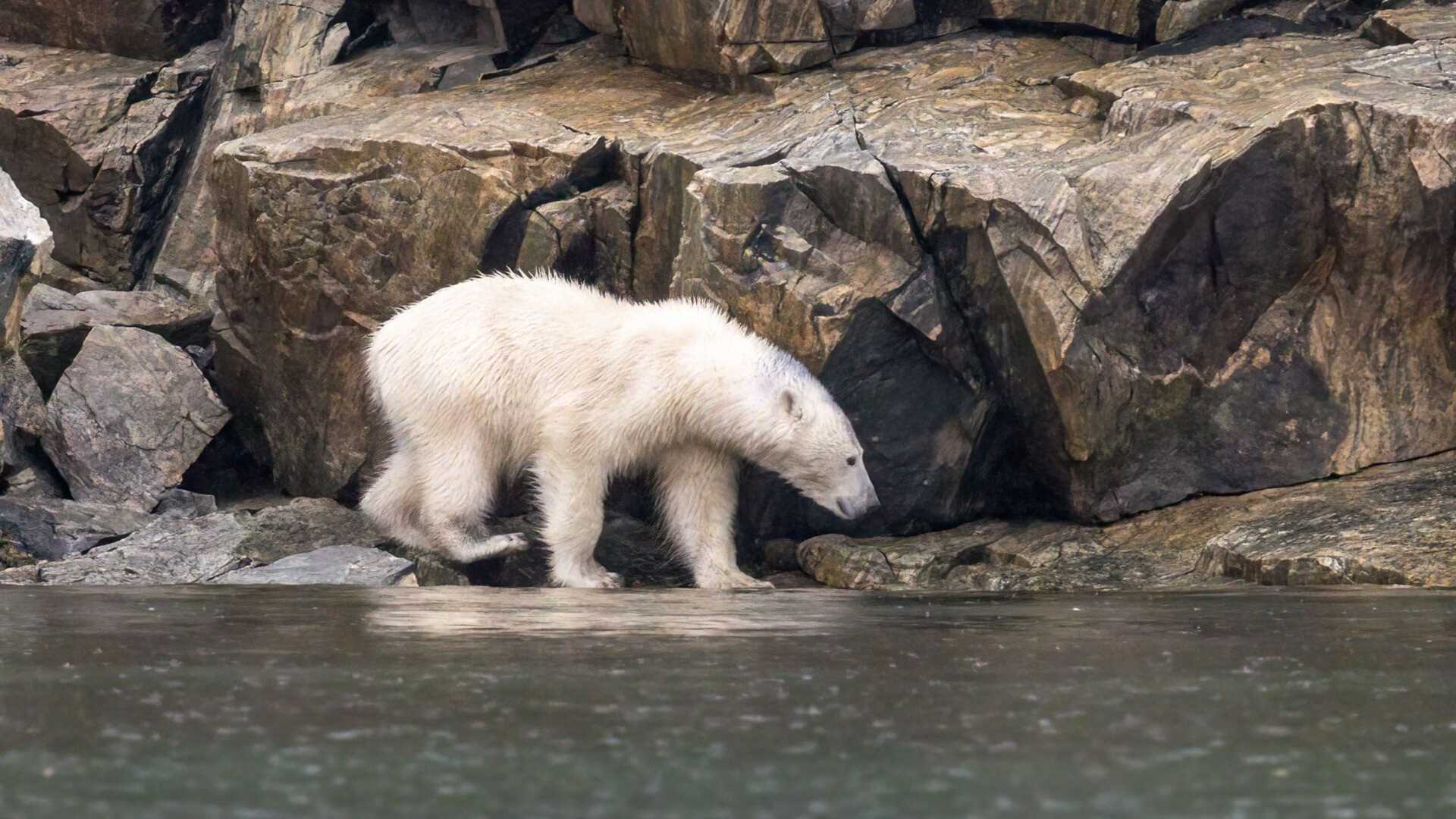 This morning we arrived at Hebron Bay with dense fog covering the coastline. It was a stark contrast to the beautiful weather of yesterday, but appropriately underscored the heavy context of the former settlement of Hebron which we were here to visit. After the area was scouted, the first ten guests arrived onshore, but only spent about 5 minutes there, as a polar bear was spotted down the shore a bit. The staff quickly and efficiently got everyone back to National Geographic Explorer, and we went out on Zodiacs instead to watch the bear as he (we believe it was a young male) ambled along the coast away from Hebron, gorging on blueberries.
