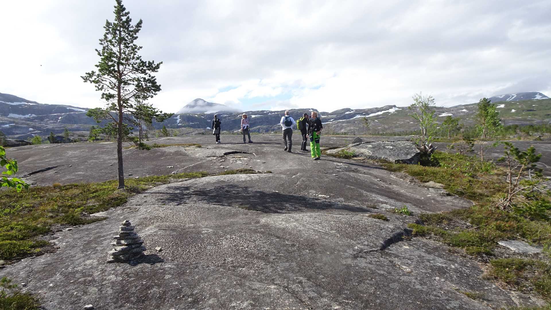 Both hikes started near the small Saami settlement Hellmobotm, and then went onto old glacial terraces covered by a lovely pine forest all the way to a magnificent waterfall stretching over a half mile to higher elevation. From the end of the fjord it is only 3.7 miles (6 km) to the border of Sweden. On the long hike we covered almost one half of that distance. The medium reached the bottom of a waterfall. This waterfall is a very special type, as water simply slides along the steeply rising polished rock without free fall. The long hike went up along the waterfall to a spectacular viewpoint high in the mountains.