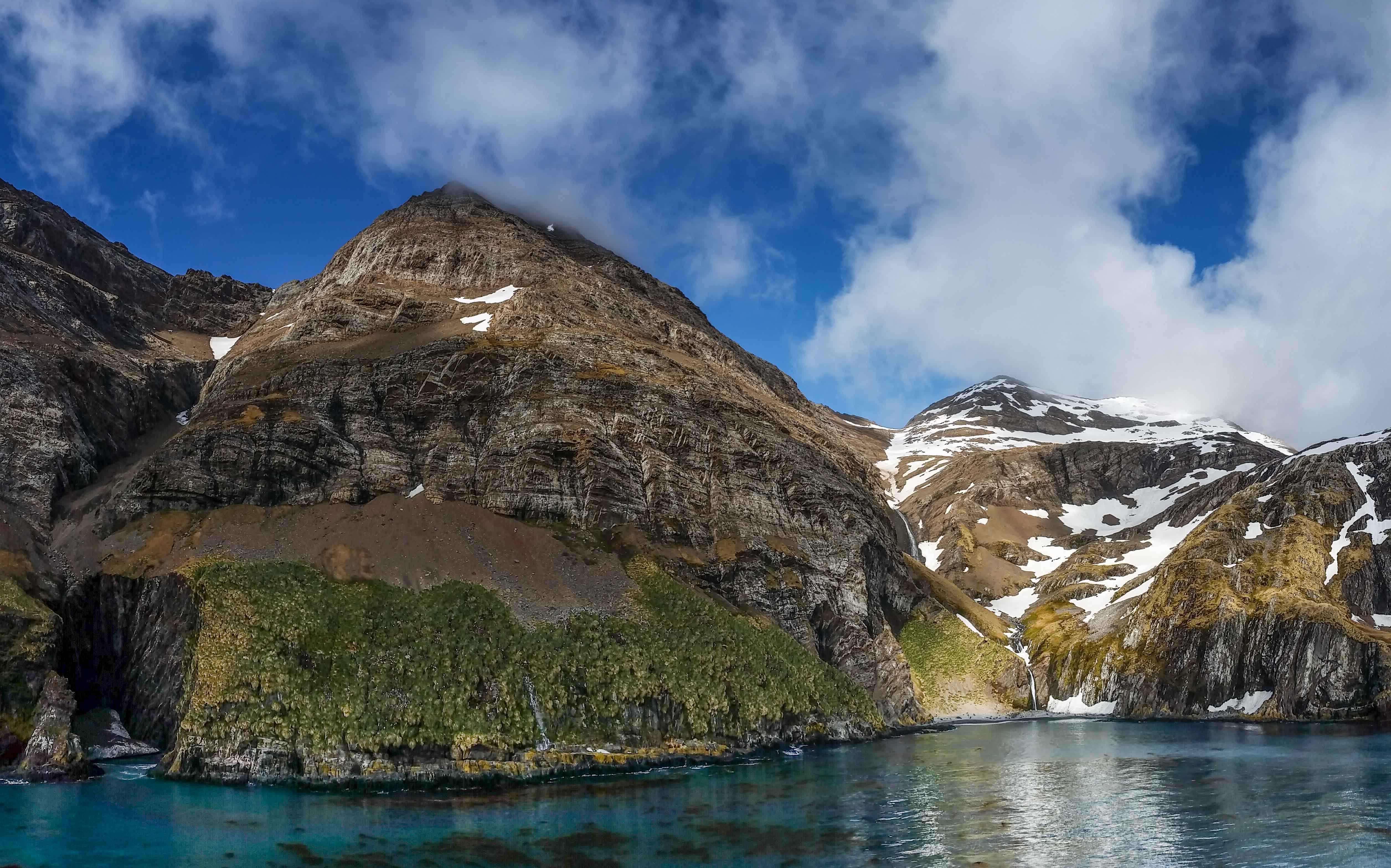 The mating calls and brays from thousands of macaroni penguins echoed throughout the steep walls of the cathedral-like Hercules Bay. The ethereal and haunting calls of courting light-mantled sooty albatross punctuated the air while they soared in tandem on their elegant wings. Elephant seals and Antarctic fur seals gathered on a small gravelly beach with a cascading waterfall pouring down behind, while their bellows, grunts, and groans added an extra layer to this soundscape. Add to all this a visual smorgasbord of brilliant blue skies and windswept clouds passing over the tops of the striking, striated peaks that make up this stunning bight in the coast of South Georgia. We spent the entire morning soaking in the sights, sounds, and even the scents from the water by Zodiac and kayak, making for an intimate and unforgettable experience.