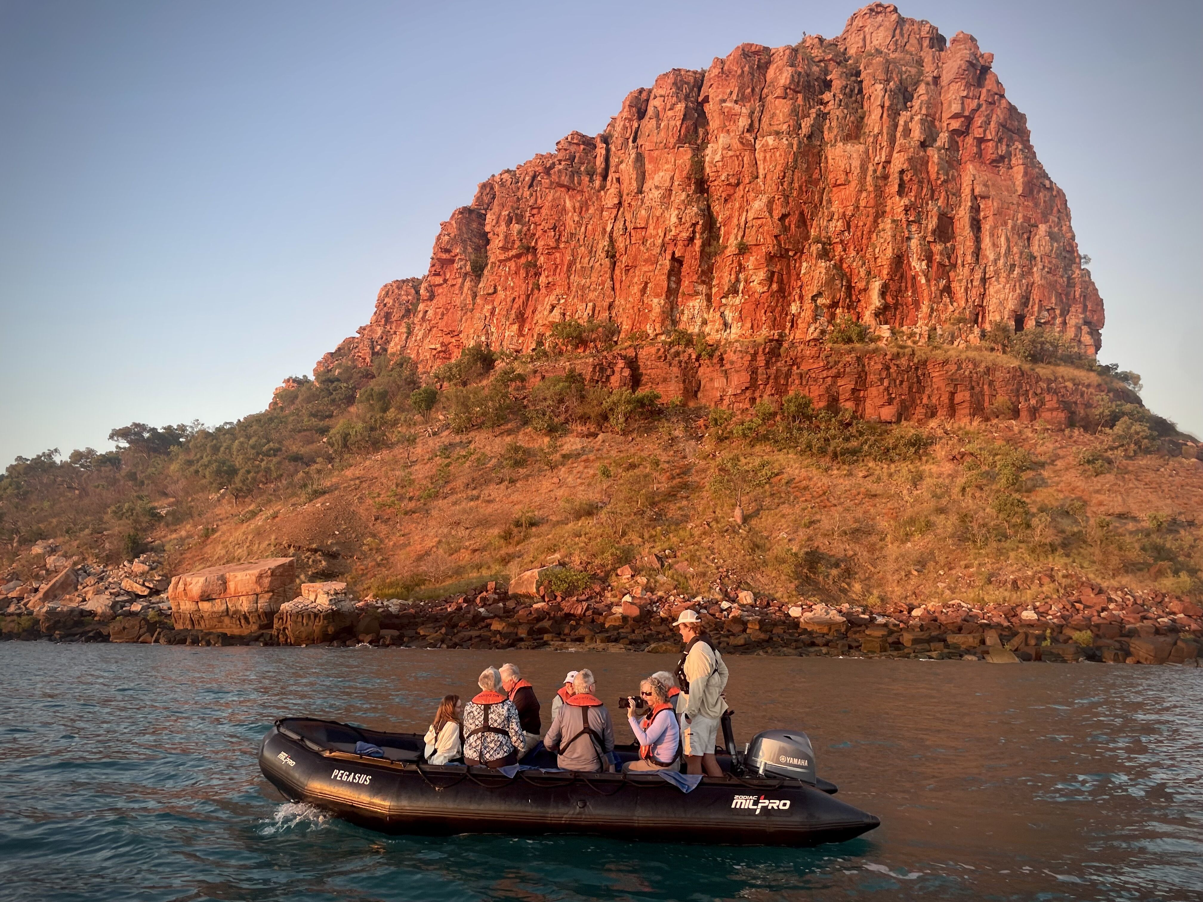 The Zodiacs set a course through the lush mangroves in search of Australia’s top-of-the-food chain predator. Surrounded by the spiraling walls of red rock sandstone set aglow by the morning light, all eyes scanned the murky waters in search of the reptilian giant. Basking in the warmth of the sun, a well-fed saltwater crocodile emerged from the tangle of mangrove roots and branches. Weighing as much as one ton, the “salty” is the world’s largest living reptile.
